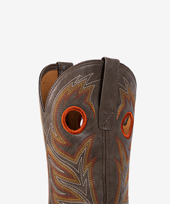 These men’s Ashen Ember Boots feature detailed embroidery on both the upper and the tall shaft, with elegant cutouts and striking orange stitching. The smoky gray palette combined with warm ember accents creates a unique, artistic look—perfect for those who want to stand out with subtle sophistication.