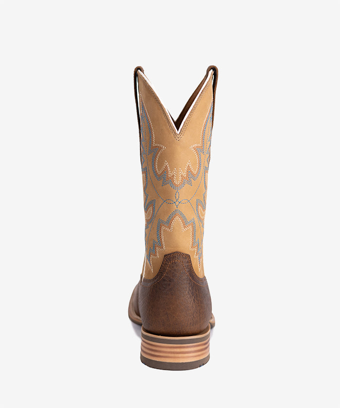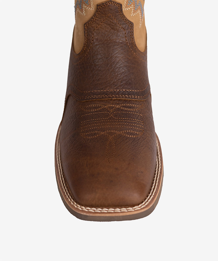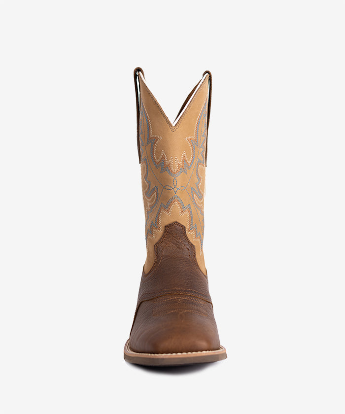 With full-grain leather, this men's vintage boot showcases natural texture and a unique brown patchwork design, blending warm tones with retro hues for a timeless Western style.