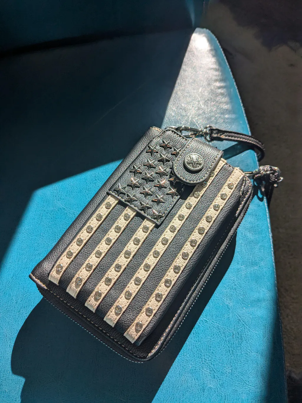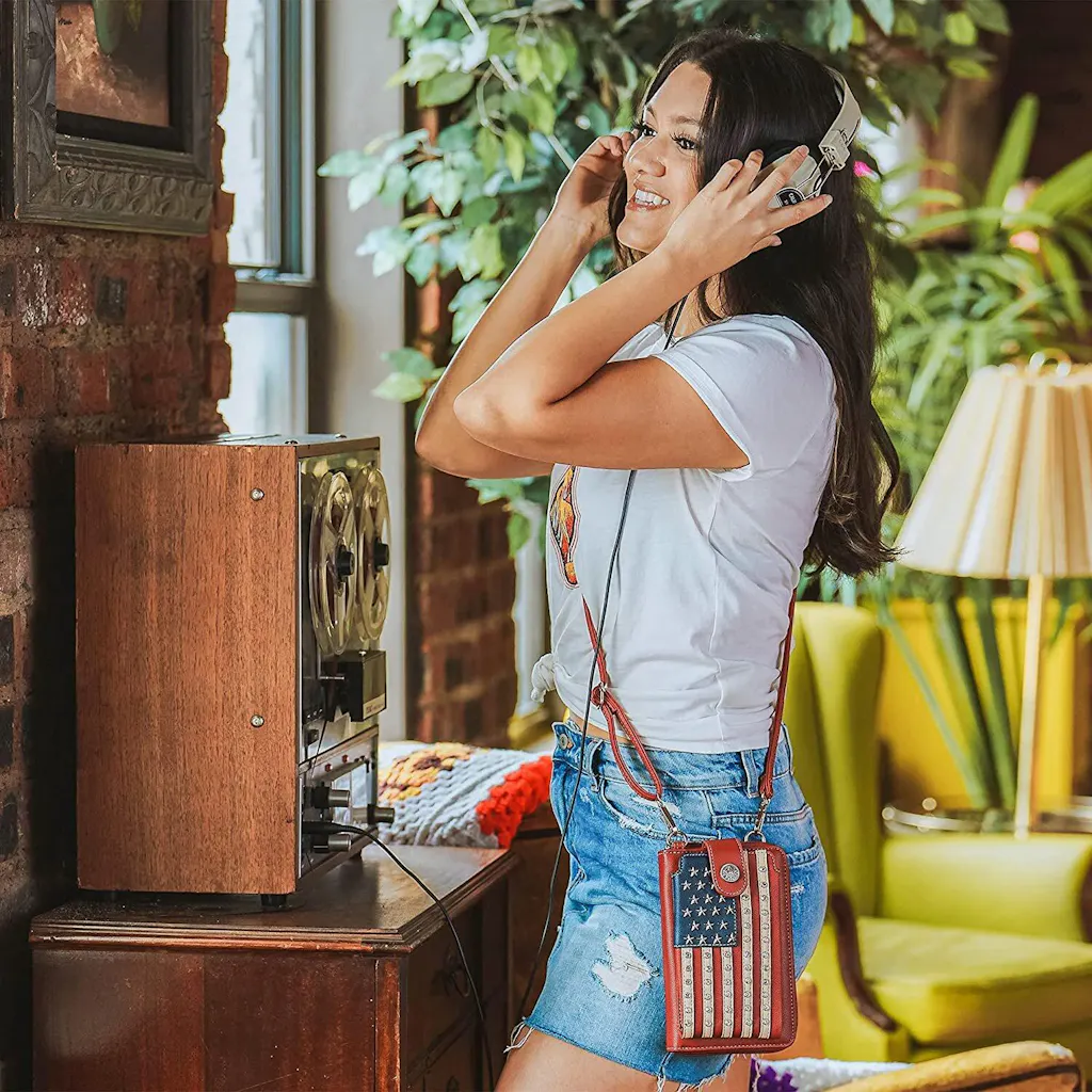Show your patriotic pride with this stylish phone crossbody bag, designed to keep your essentials organized and secure wherever you go. Featuring a bold American flag design with metallic accents, this cell phone crossbody bag includes multiple interior card slots and compartments for easy organization.