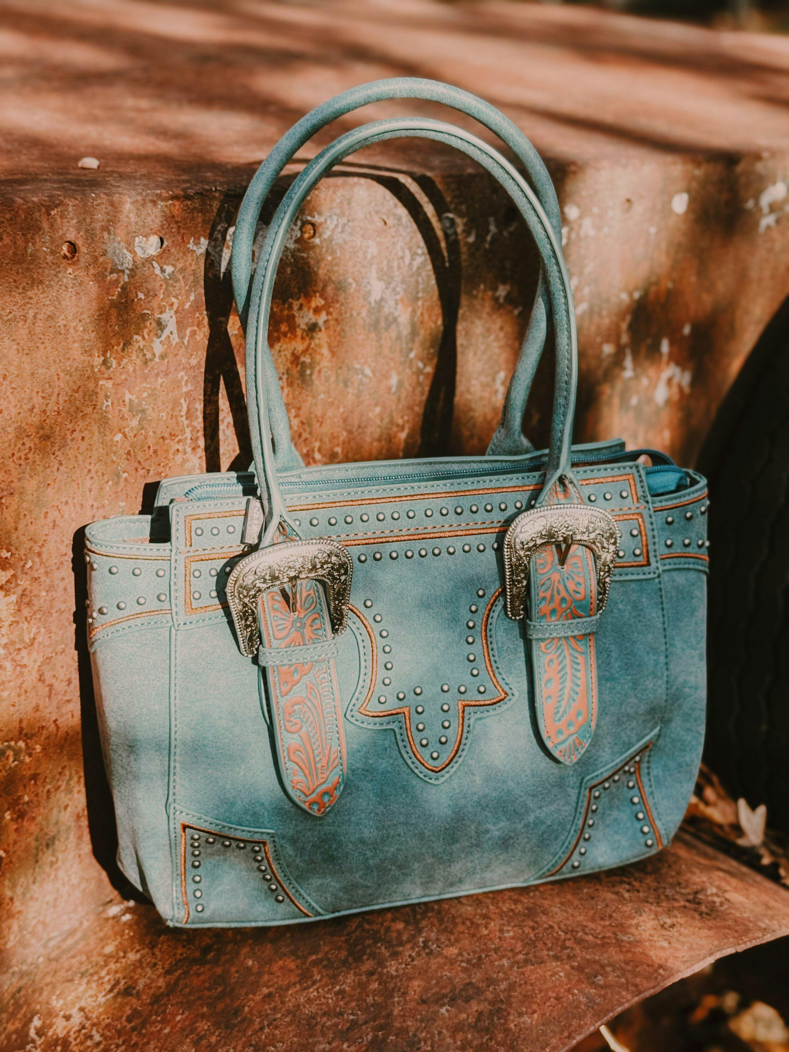 This Montana West concealed carry tote is made of synthetic leather. With an antique silver floral buckle on the front, it's vintage and fashionable. Accented with silver studs and this concealed carry tote is the best western tote for a delicate woman.