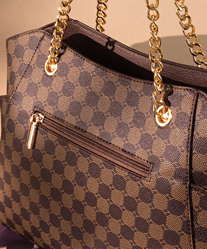 Dual handles combining gold-tone chain links with matching leather straps enhance the overall sophistication while ensuring comfortable carry, making this chain tote bag suitable for commuting, dates, and business occasions.