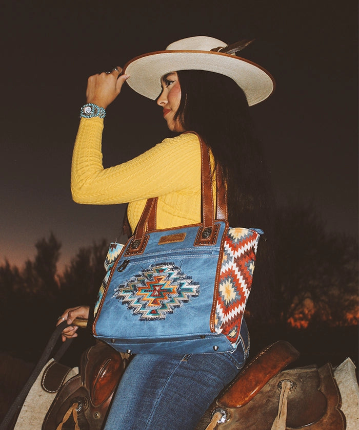 Denim Canvas construction with trimmed synthetic leather, embroidered Aztec design applique, glitter denim frayed detail, and multi-color southwestern print for a bold, artisanal aesthetic.