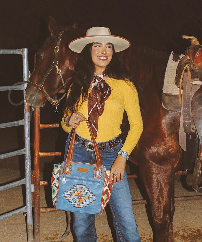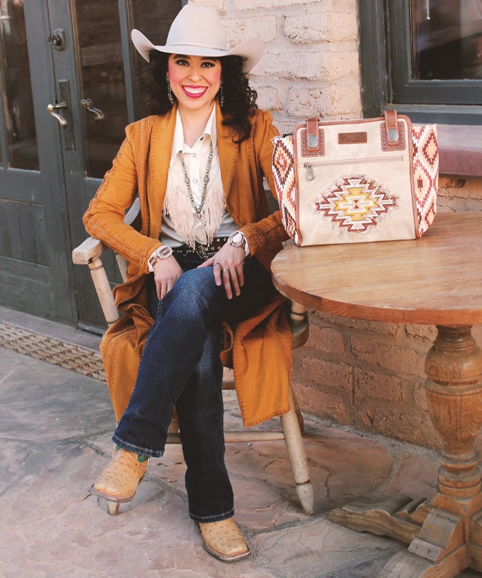 Oval silver conchos on both straps and discreet zippered pockets ensure essentials stay safe while elevating the bag’s southwestern-inspired aesthetic.