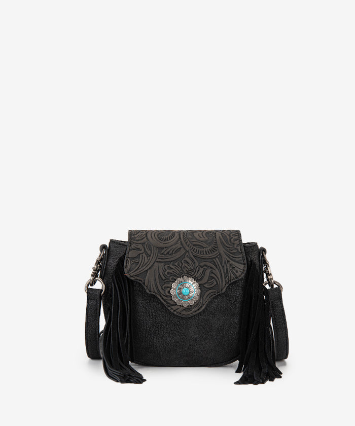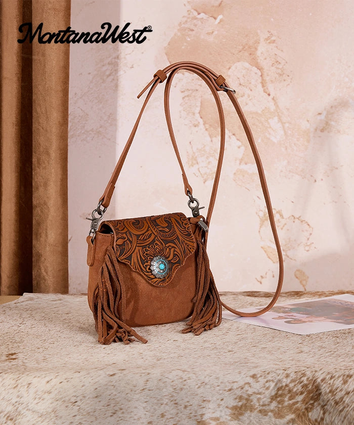 The Montana West Flap Fringe Crossbody Purse is a stylish, western-inspired, compact bag for daily use. Crafted from synthetic leather, it features a western-style embossed flap and metal ring closure.