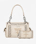 The Montana West Studded Concealed Carry Satchel combines style and security with a dedicated hidden compartment for easy firearm access. Crafted from durable synthetic leather, this studded bag features reinforced stitching and a magnetic flap closure.
