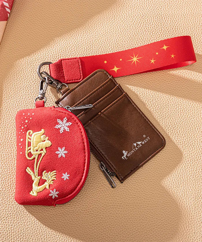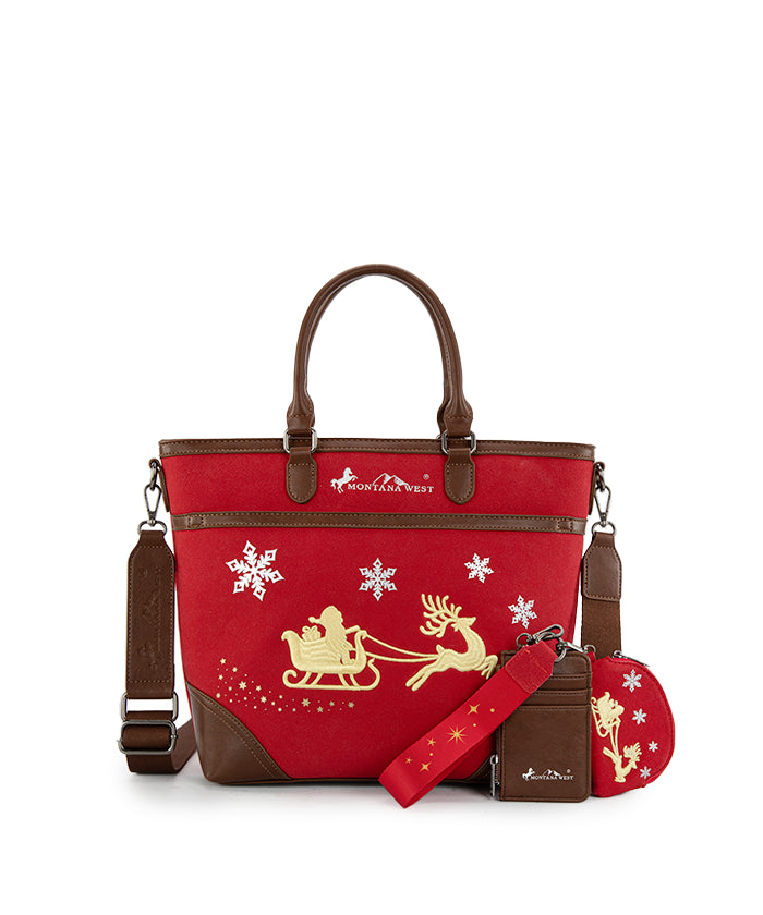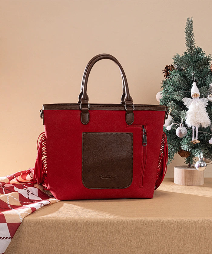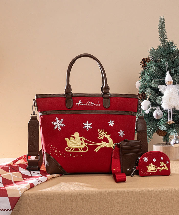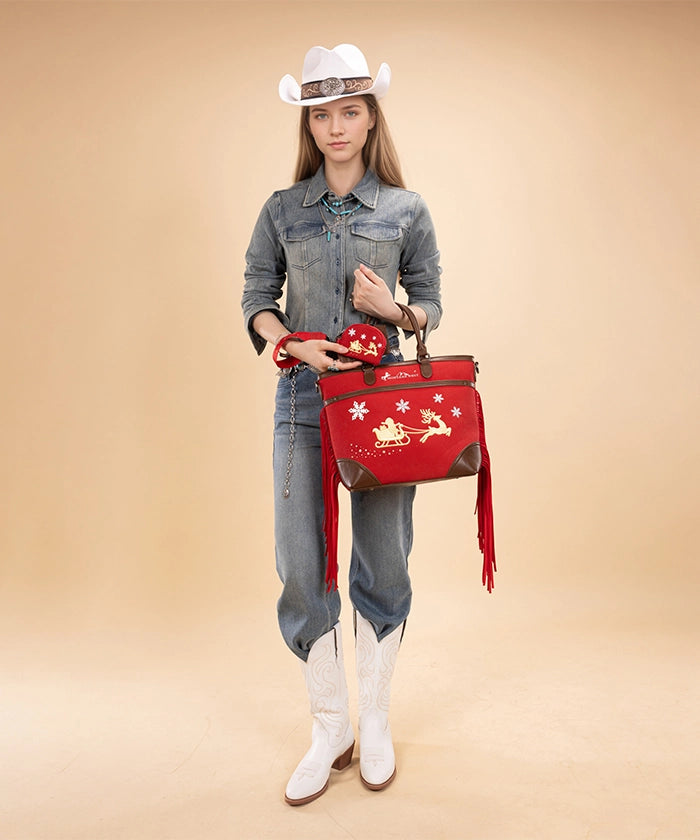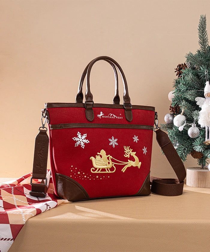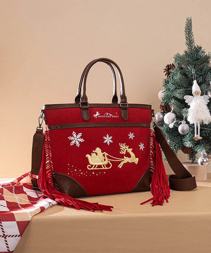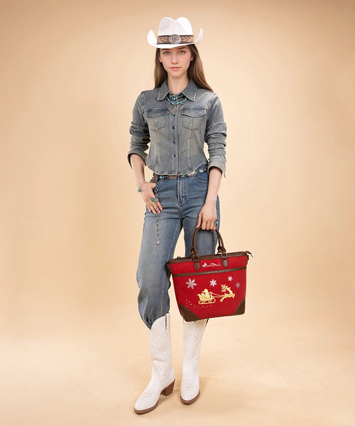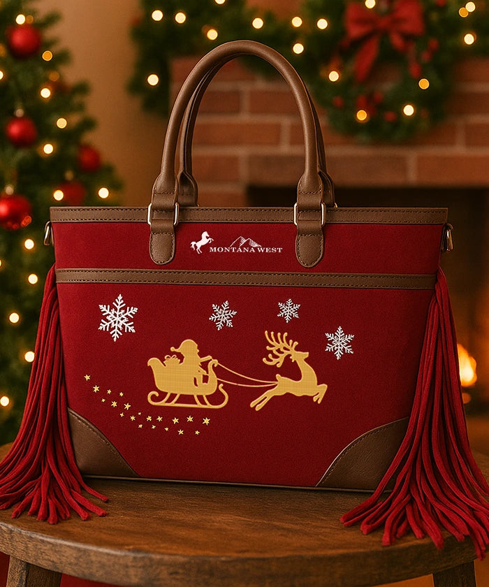 🎅 Ride into the Holidays in true Western style with this exclusive Christmas tote bag from Montana West. Crafted in a classic red suede texture with rich brown leather handles, this holiday handbag features intricate golden Santa & reindeer sleigh embroidery, delicate snowflakes, and a sprinkle of golden stars—bringing festive cheer to your wardrobe.