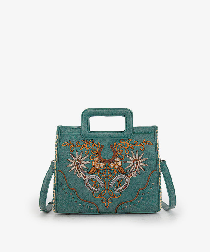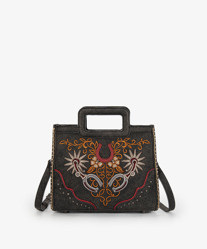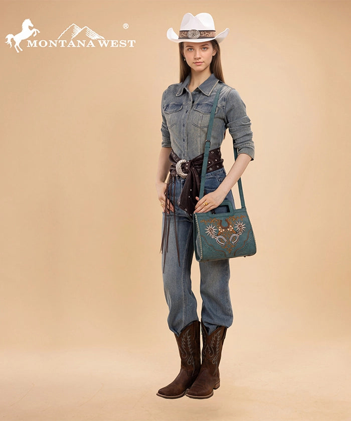 The Montana West embroidered handbag showcases intricate western-inspired embroidery with horseshoes and floral patterns. Crafted from durable synthetic leather, this floral embroidered handbag features a structured tote design with a detachable crossbody strap for versatile wear.