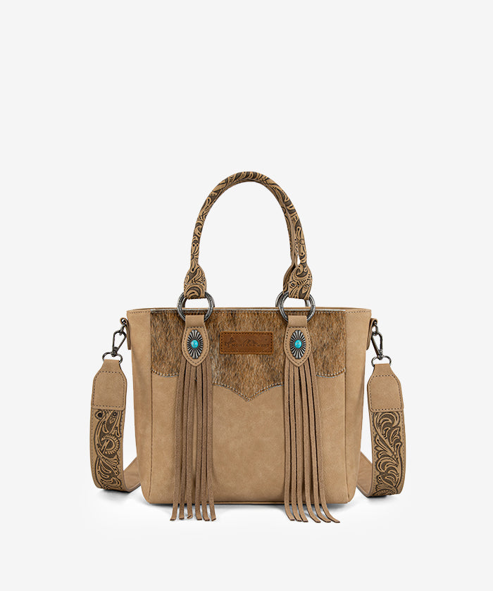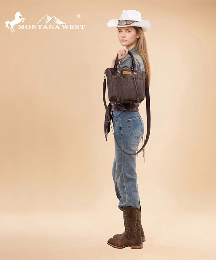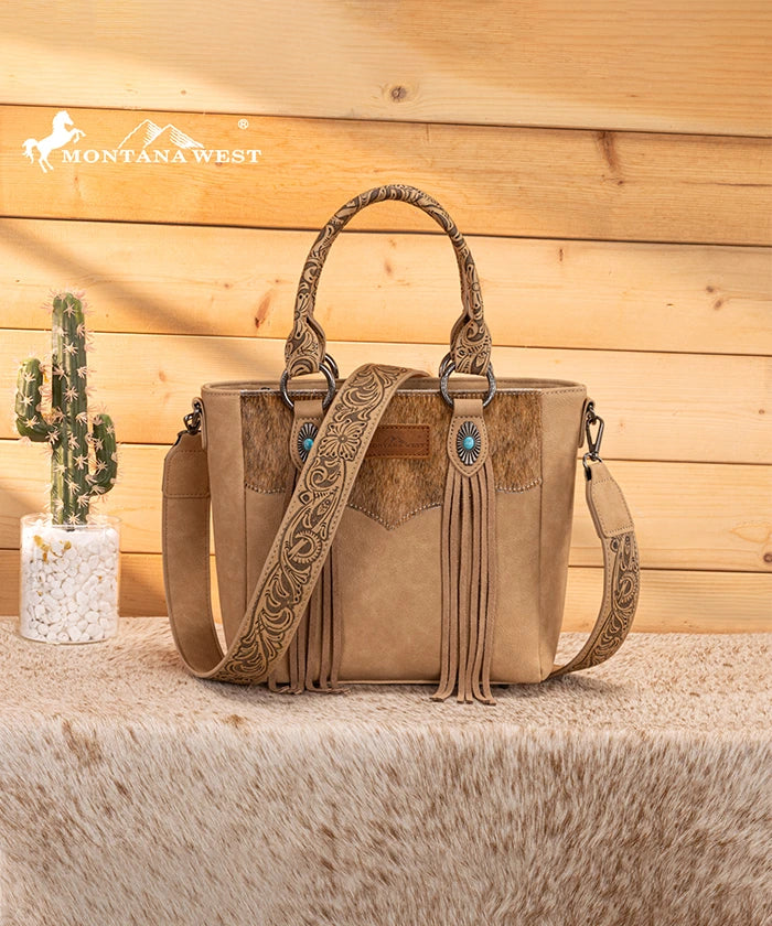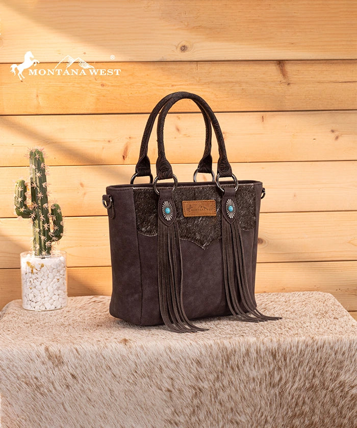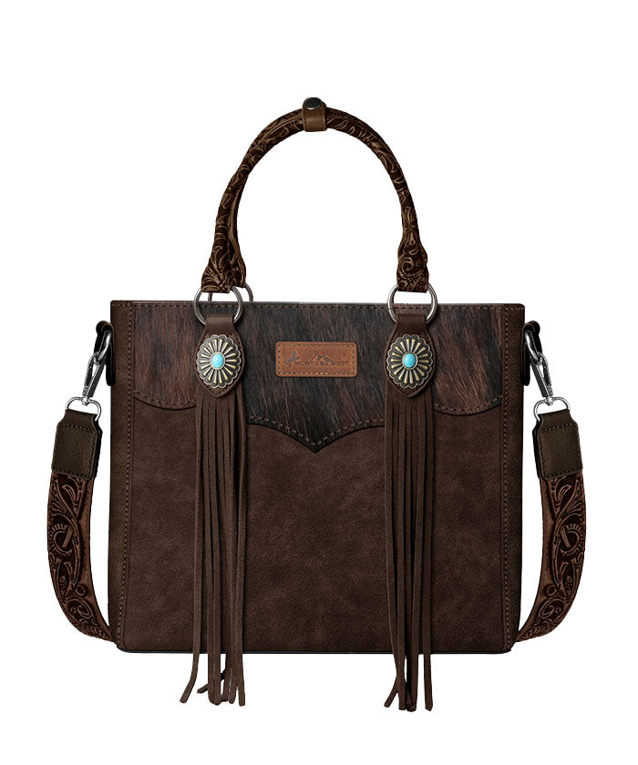 The Montana West Fringe Bag combines authentic western style with everyday functionality. Crafted from faux leather with a hair-on-hide texture, it features hand-tooled handles and turquoise conchos. Western fringe details add movement and rustic charm.