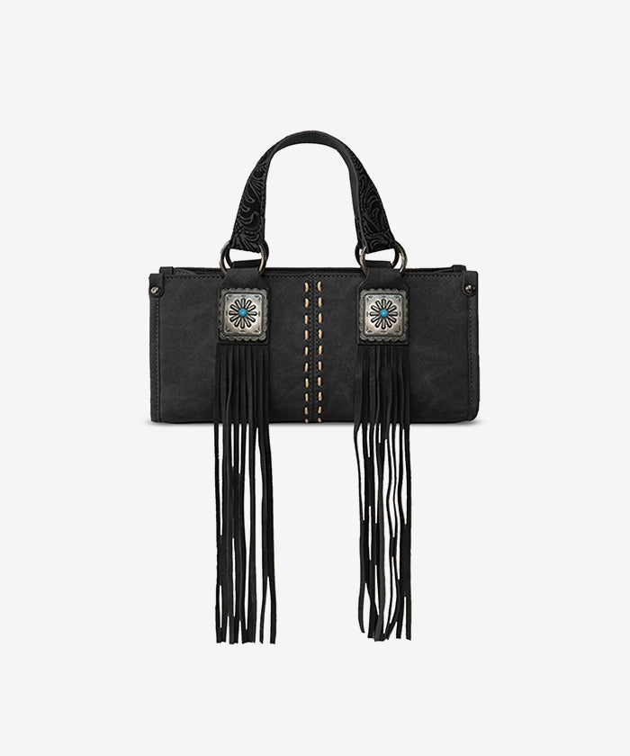 Montana West Women's Western Fringe Concho Mini Crossbody Bag – A stylish and compact vegan leather purse featuring decorative antique silver-turquoise conchos, leather fringe accents, and a detachable adjustable crossbody strap (up to 46"). With a secure zip-top closure, interior zippered pocket, and floral-tooled detailing, this bohemian-chic bag is perfect for everyday wear, festivals, and casual outings
