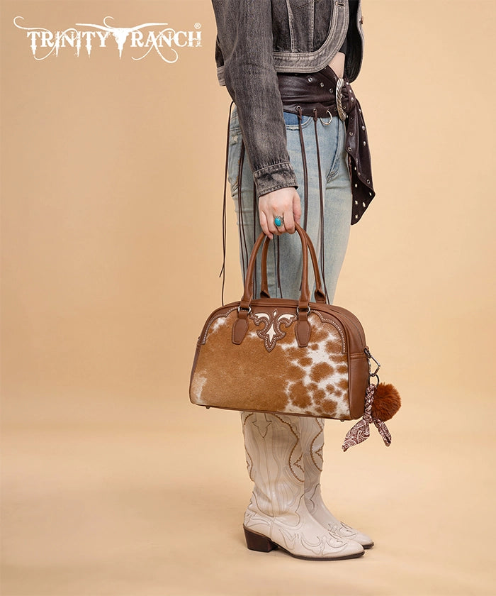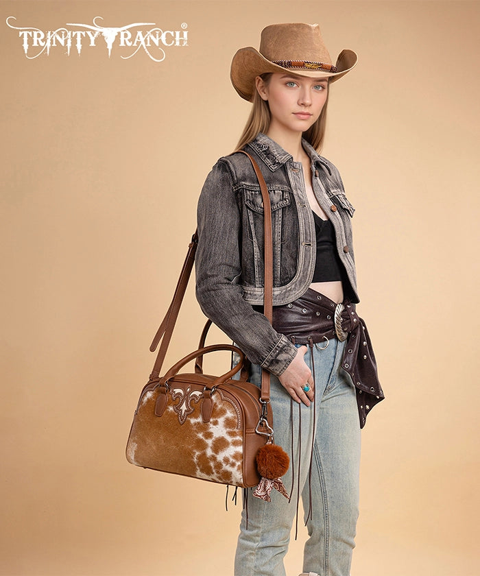 This Trinity Ranch hair-on cowhide crossbody purse and wallet collection pairs rustic charm with everyday functionality. Crafted from PU leather with genuine hair-on cowhide accents, each piece features signature Western boot-stitch cut-outs and detailed stitching for a classic yet stylish look.