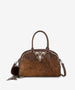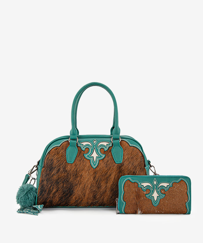 The matching cowhide crossbody purse delivers versatility with double handles and a detachable/adjustable crossbody strap for hands-free wear. Its top zipper closure opens to a structured interior with a zip pocket and two open pockets. A detachable pom-pom scarf charm brings a playful finishing touch.