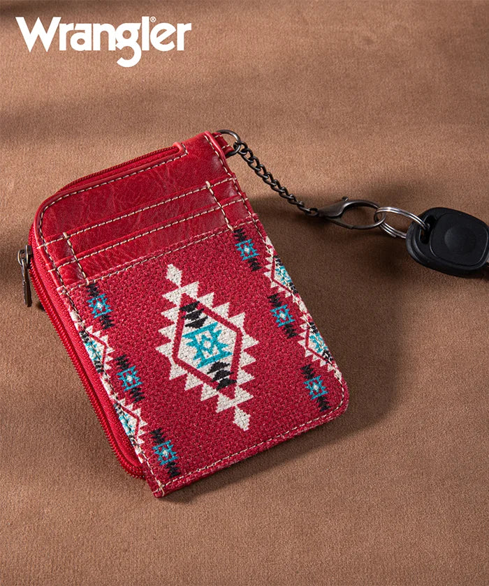 This Wrangler All-Over Aztec Print Mini Zip Card Case seamlessly blends Southwestern artistry with everyday practicality. Crafted from durable synthetic leather and canvas, it showcases a vibrant Southwestern print that embodies rugged charm and cultural flair.