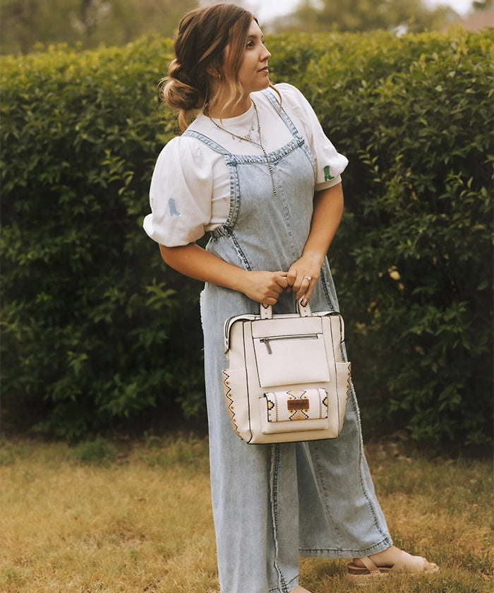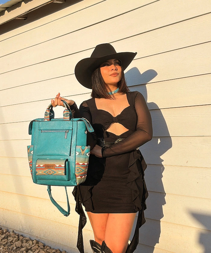 The Wrangler Aztec backpack blends Western-inspired style with everyday function. Featuring an intricate Aztec pattern on handles and a matching wallet, this synthetic leather bag offers durable texture and bold design.