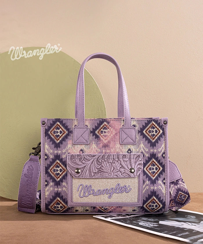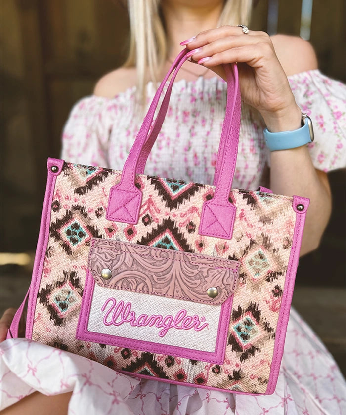 The Wrangler canvas tote bag combines durable construction with boho-chic style, perfect for everyday carry. Featuring a vintage Western geometric pattern and leather-trimmed details, it offers a roomy interior with multiple compartments for organized storage.