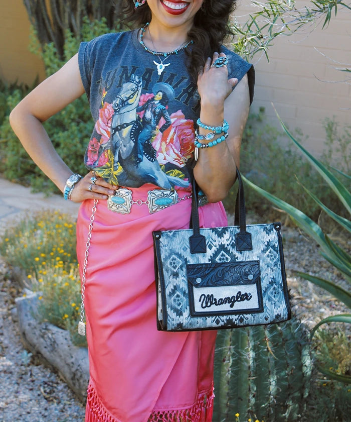 The Wrangler canvas tote bag combines durable construction with boho-chic style, perfect for everyday carry. Featuring a vintage Western geometric pattern and leather-trimmed details, it offers a roomy interior with multiple compartments for organized storage.