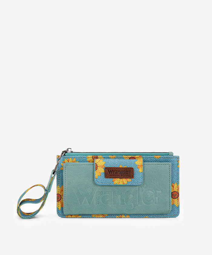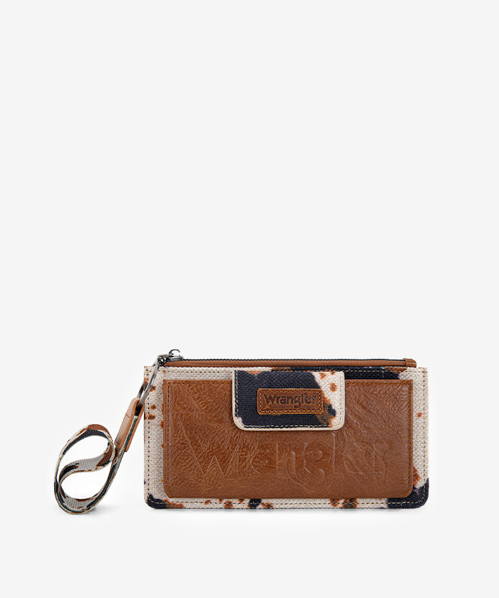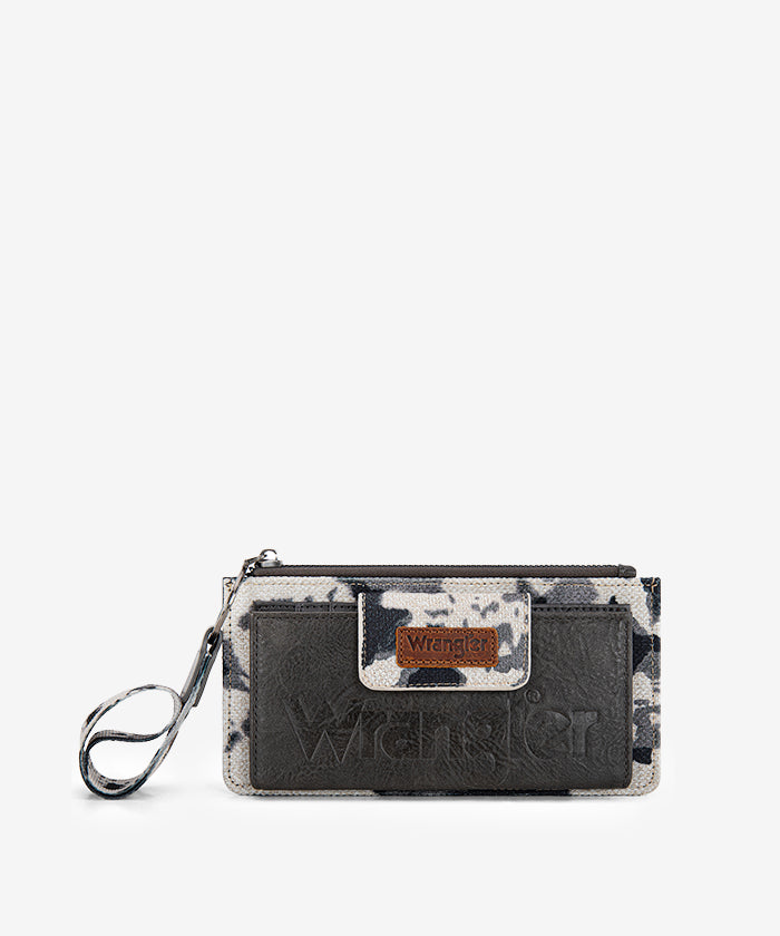 It features a prominent Wrangler logo appliqué for iconic Western-inspired branding. Equipped with a button closure and a zippered compartment, this Wrangler women's wristlet is safe and functional.