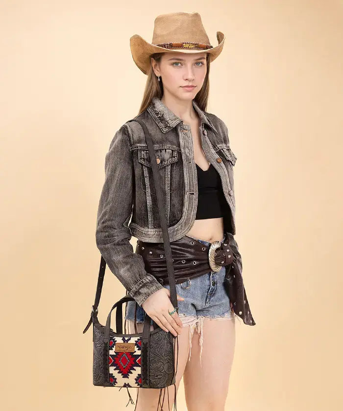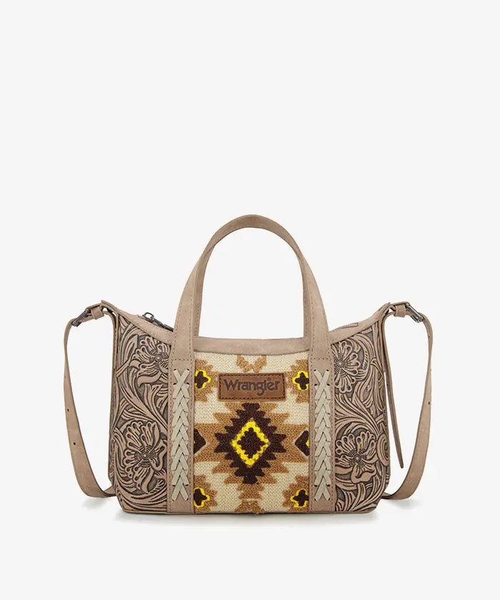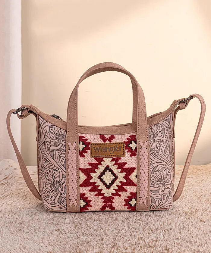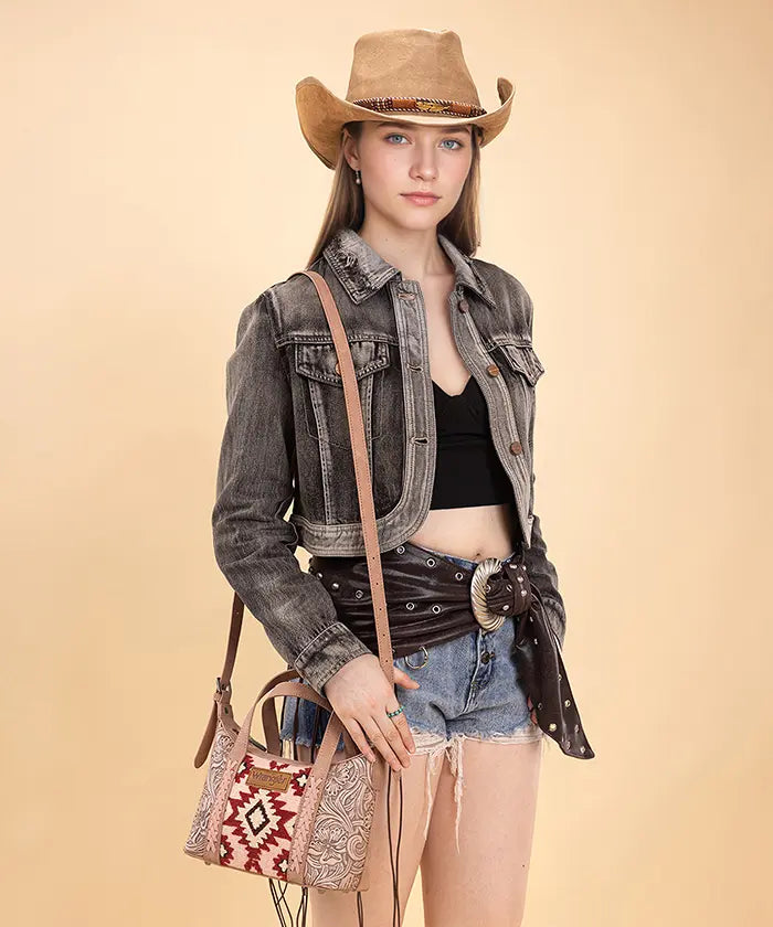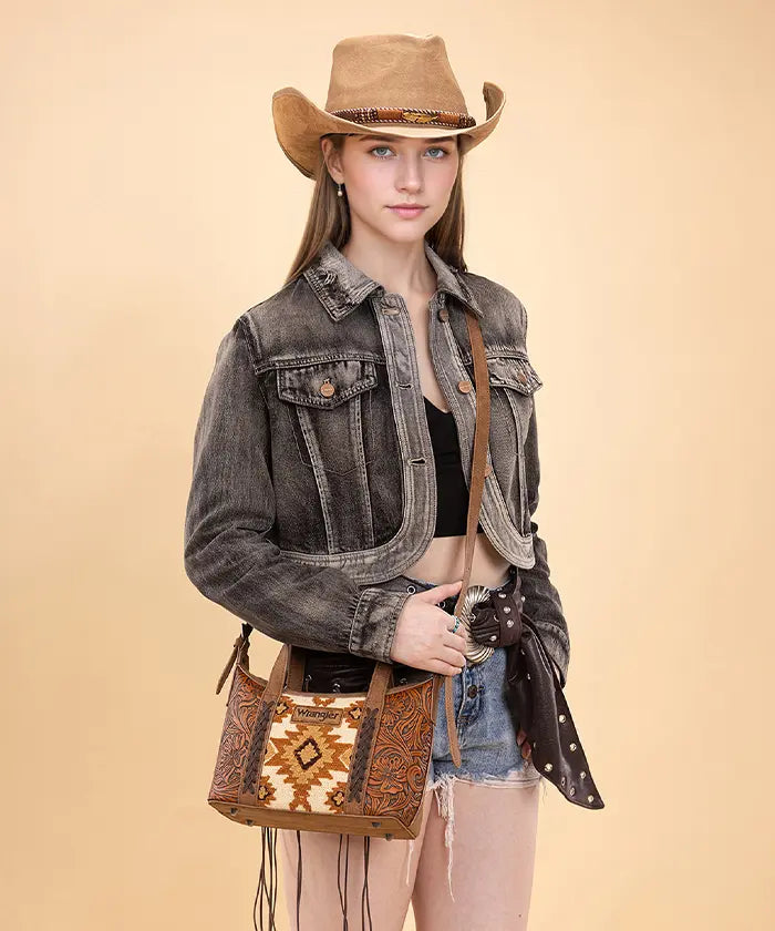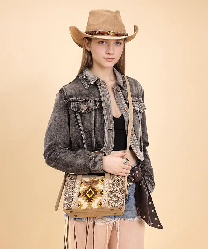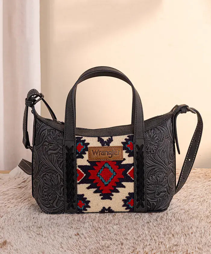 The Wrangler Aztec Printed Crossbody Purse blends retro style and practicality, showcasing a vibrant Aztec Retro print on durable PU leather with floral tooled designs and whipstitch details.