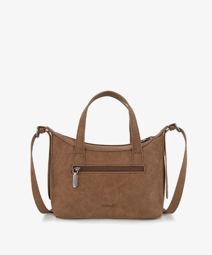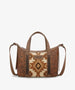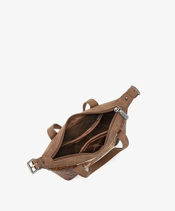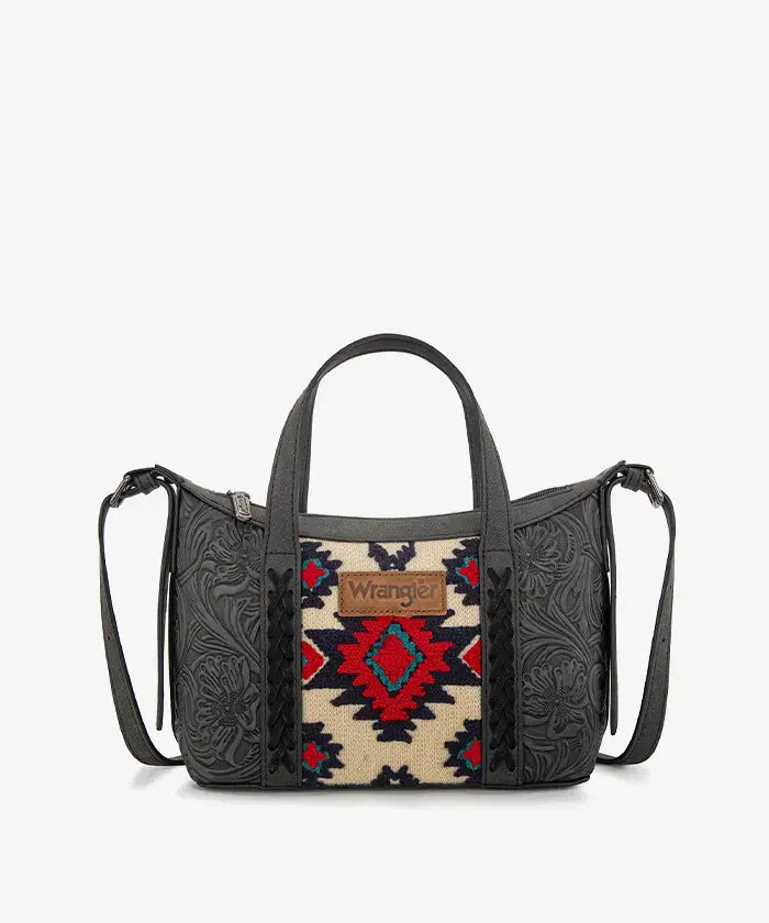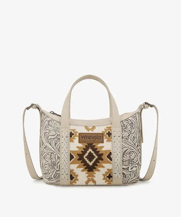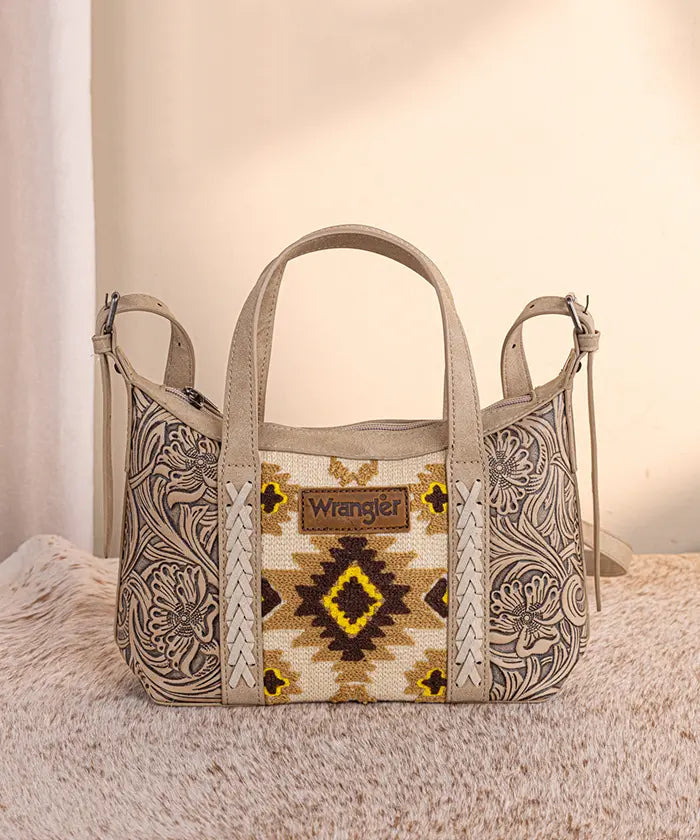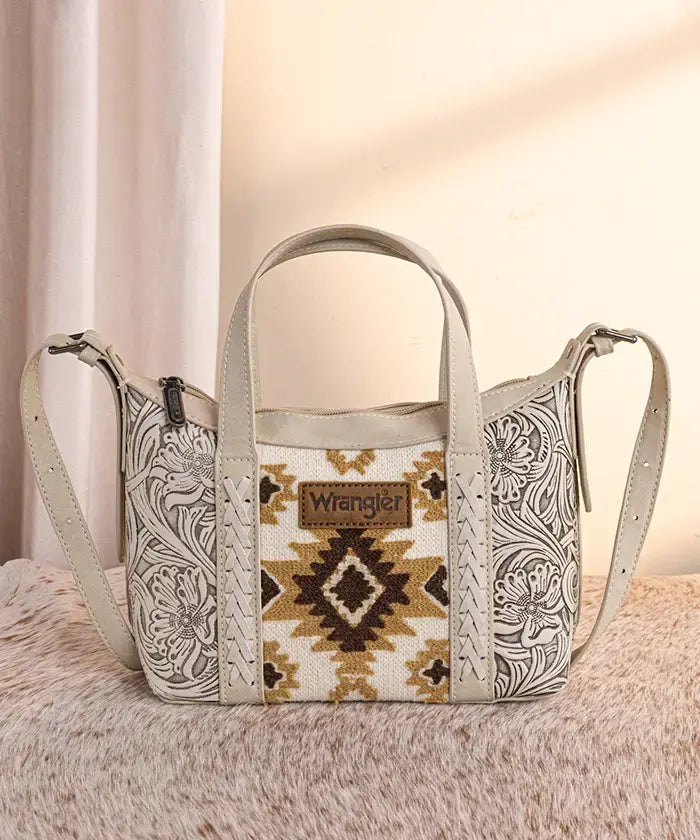 The Wrangler Aztec Printed Crossbody Purse blends retro style and practicality, showcasing a vibrant Aztec Retro print on durable PU leather with floral tooled designs and whipstitch details.