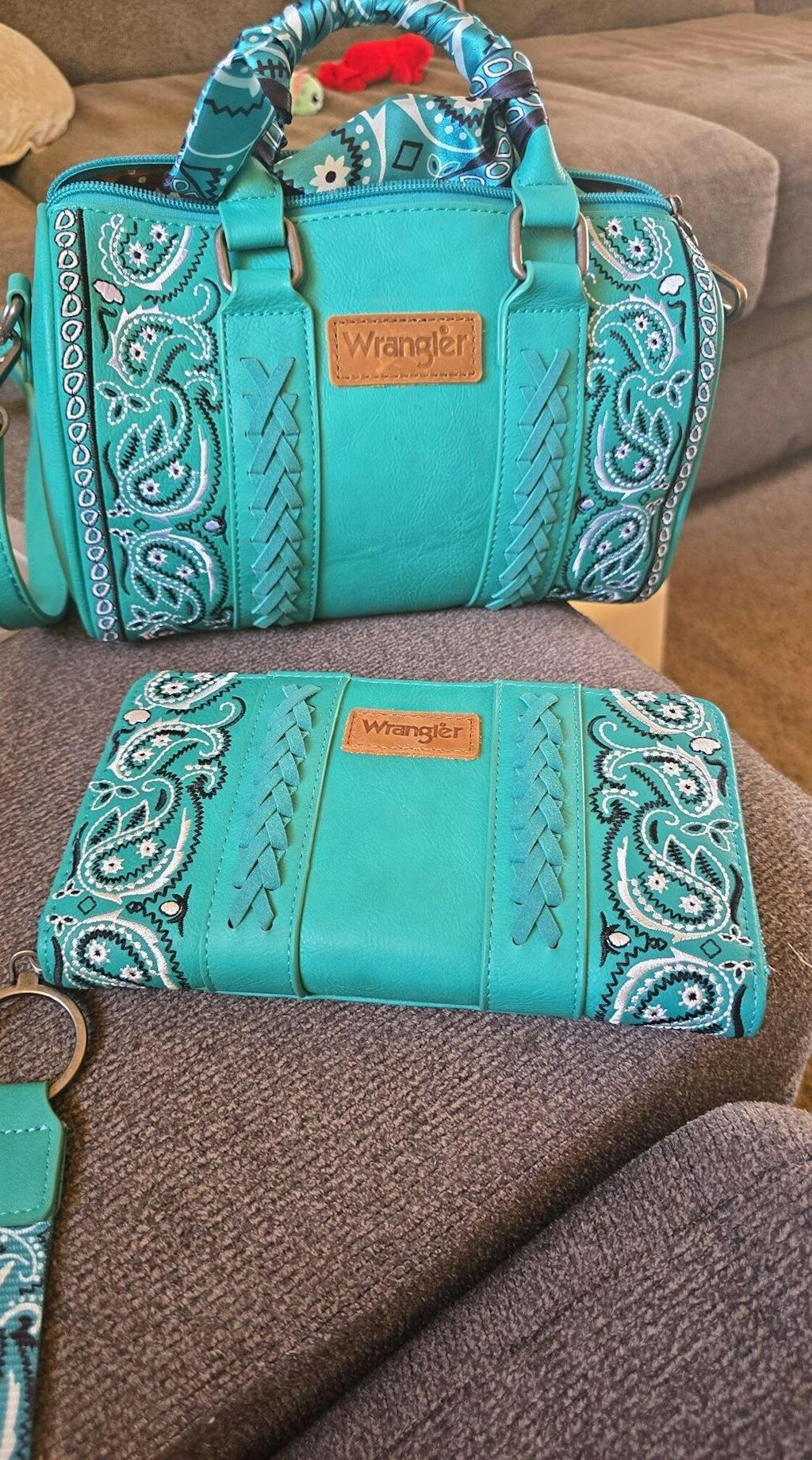The Wrangler Braided Paisley Handbag combines timeless Western style with practical everyday design. Crafted from faux leather, this structured handbag features braided side detailing and paisley-pattern accents that highlight its classic country-inspired character.