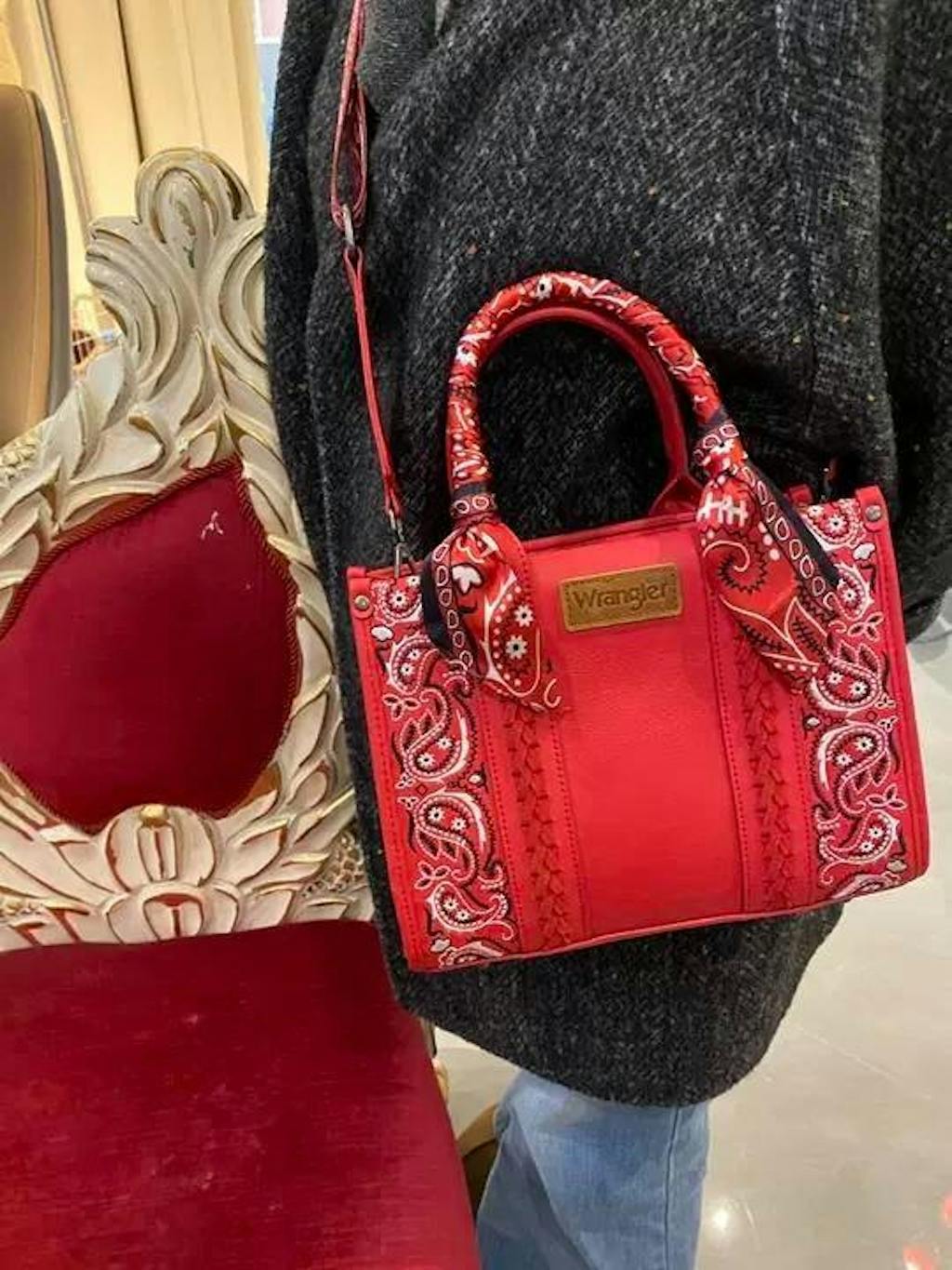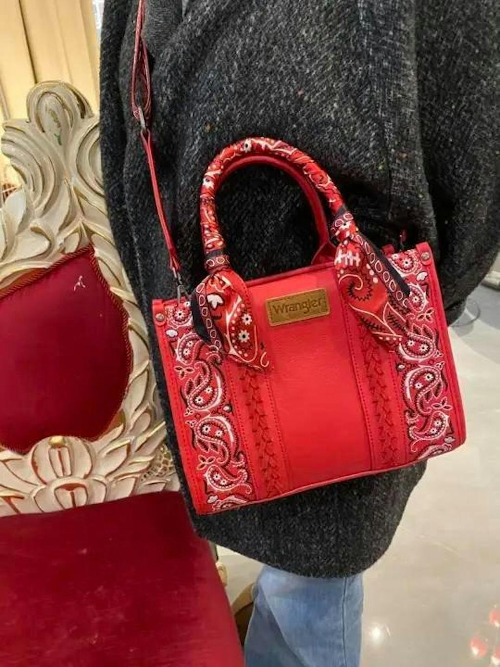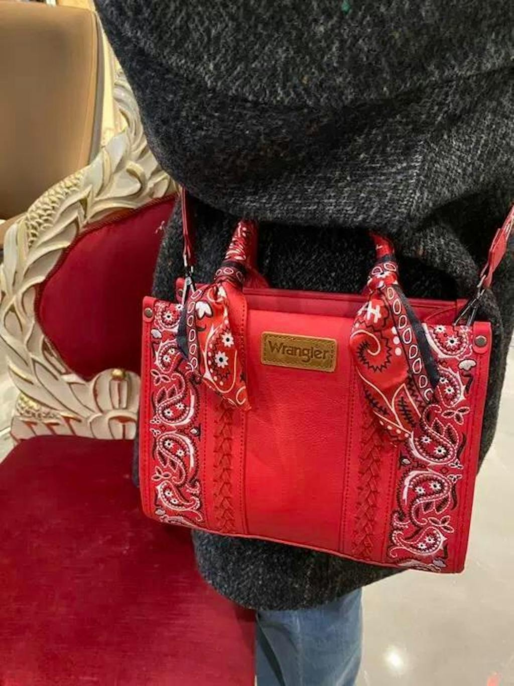 One top handle is uniquely wrapped with a paisley scarf detail, adding a distinctive Western touch and elevated visual appeal. Designed for versatility, this handbag features sturdy top handles and a detachable shoulder strap, allowing it to be carried by hand, worn on the shoulder, or styled as a cross-body bag. Perfect for daily essentials, making it ideal for workdays, casual outings, and Western-inspired outfits.