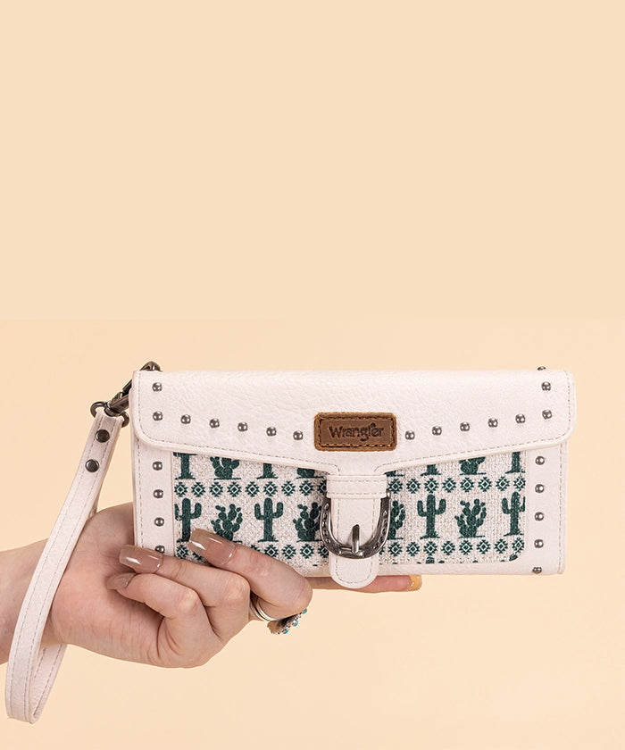 The Wrangler cactus pattern wallet wristlet combines western flair with modern function. Crafted from durable vegan leather, this women's wallet wristlet features an embroidered cactus pattern and silver studs with a secure snap closure.