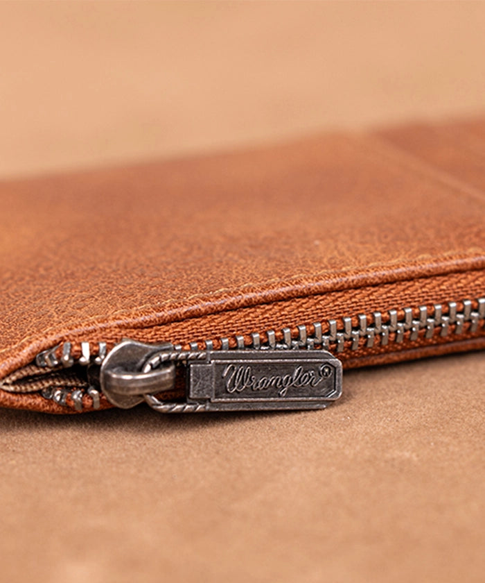 The Wrangler zip card holder is a compact Western-inspired accessory designed for everyday ease. Featuring a bold cow-print pattern, this zip card case combines faux leather and canvas for durability and style.