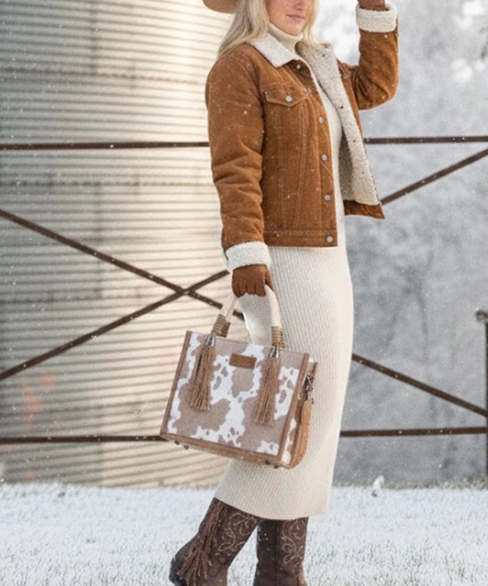 Saddle up for standout style with the Wrangler tote bag with cow print rope. This eye-catching western purse features a bold cowprint, a sturdy woven rope handle, and traditional whipstitch detailing with playful leather tassels.