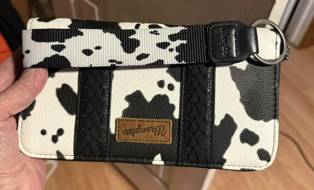 This Wrangler Cow Print Wallet combines bold Western flair with modern functionality. Crafted from synthetic leather and detailed with eye-catching cow print hair-on cowhide and a front Wrangler logo applique, this cow print wallet exudes rugged, ranch-inspired charm.