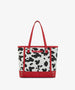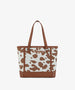 This Wrangler cow print tote features a top zipper closure to keep your belongings safe, with zip pockets for quick access to your phone, keys, and wallet.