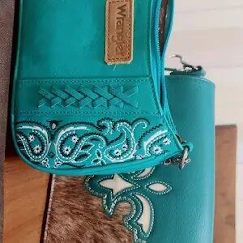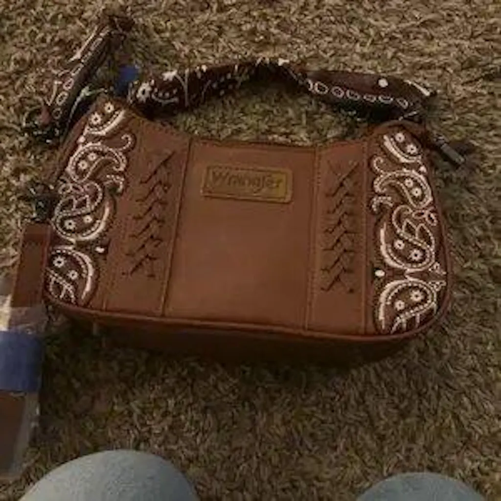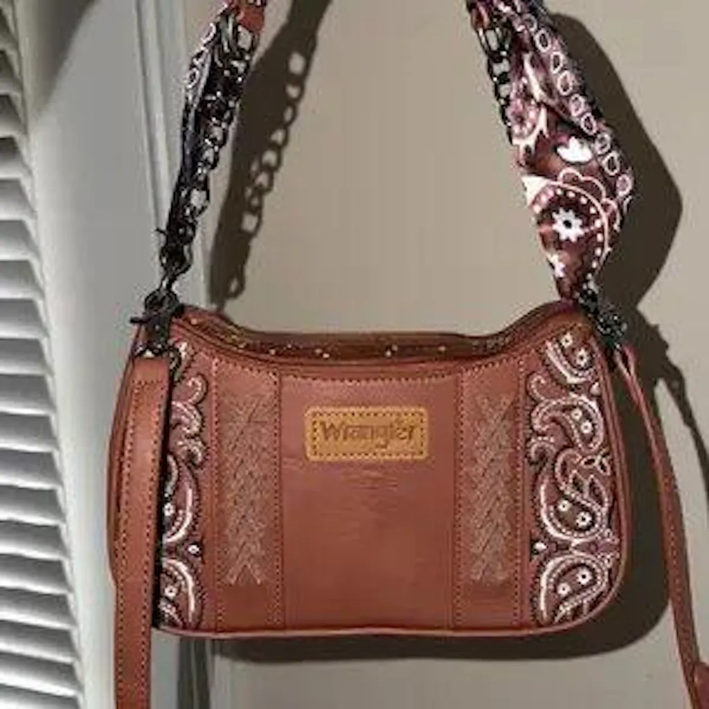 Discover the Wrangler Paisley Chain Shoulder Bag, a boho-western style faux leather bag with a paisley pattern and braided detailing. The standout shoulder strap is wrapped with a patterned scarf detail and finished with chain accents, adding a stylish and versatile touch.