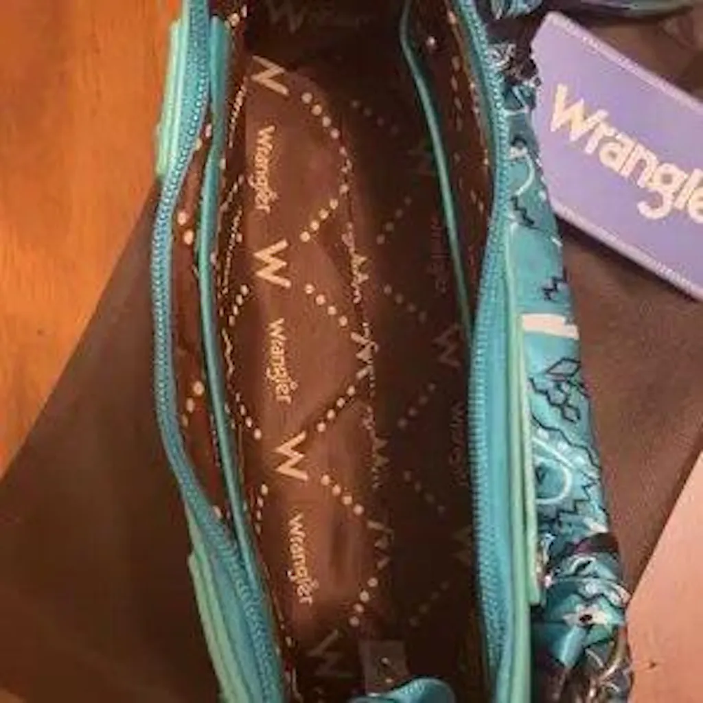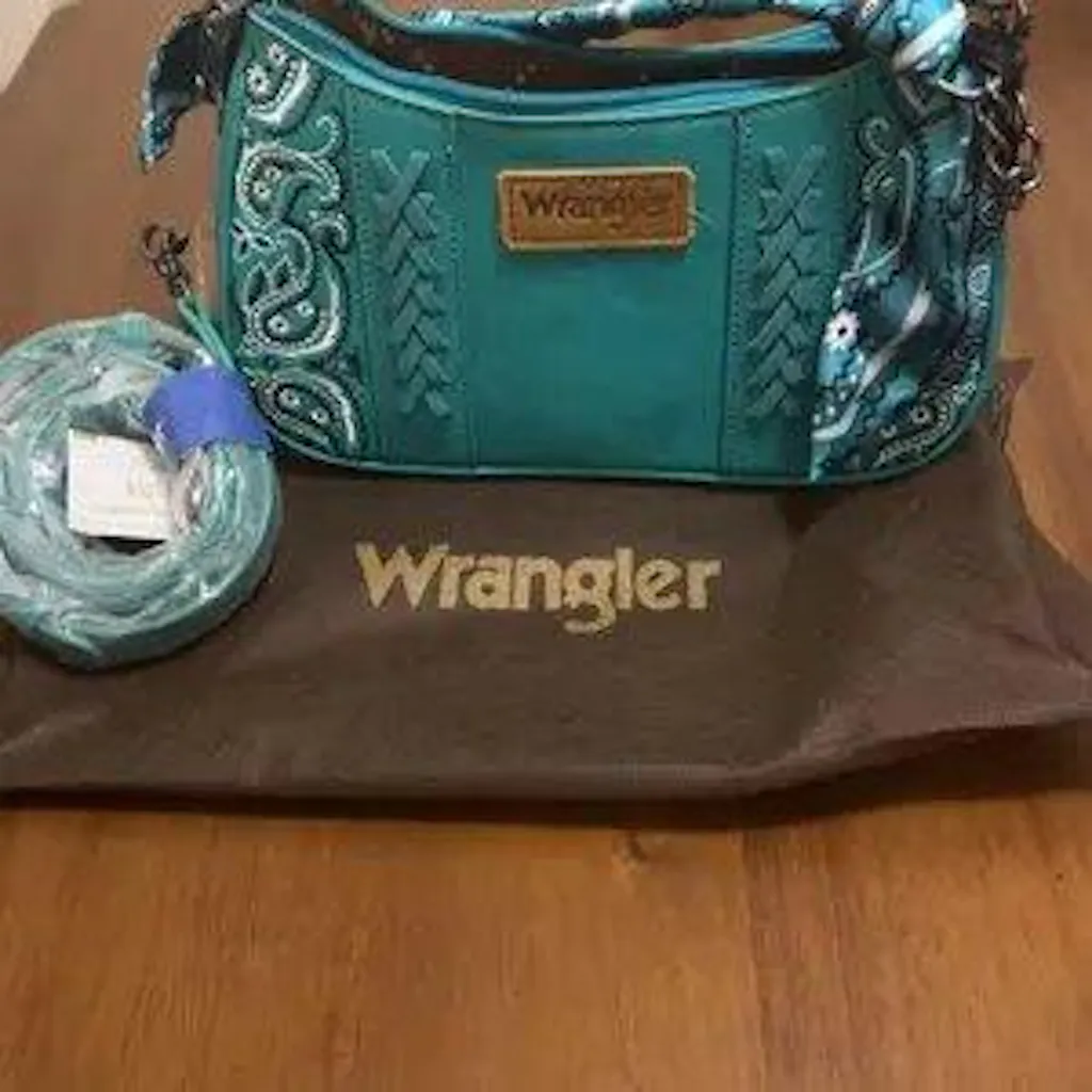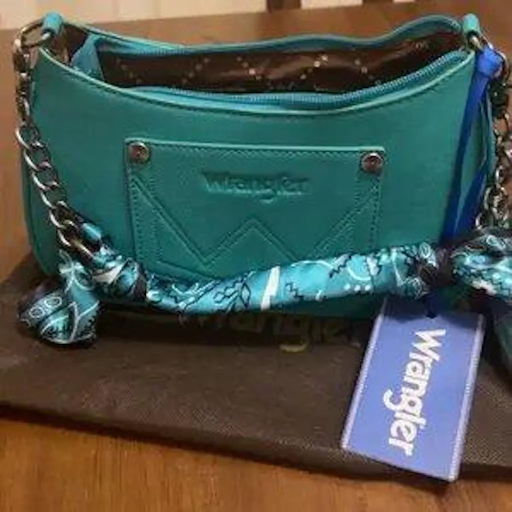Discover the Wrangler Paisley Chain Shoulder Bag, a boho-western style faux leather bag with a paisley pattern and braided detailing. The standout shoulder strap is wrapped with a patterned scarf detail and finished with chain accents, adding a stylish and versatile touch.