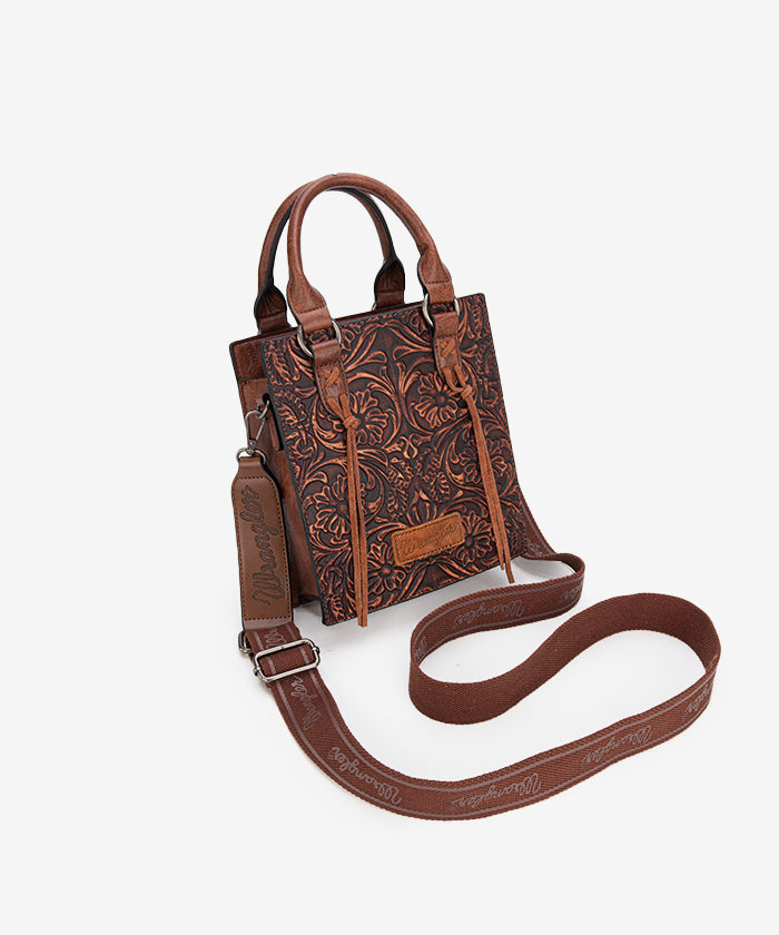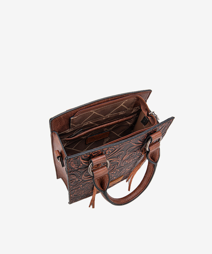 Floral tooling adds rustic Western elegance to this compact crossbody. Each detail reflects timeless leather artistry and charm.