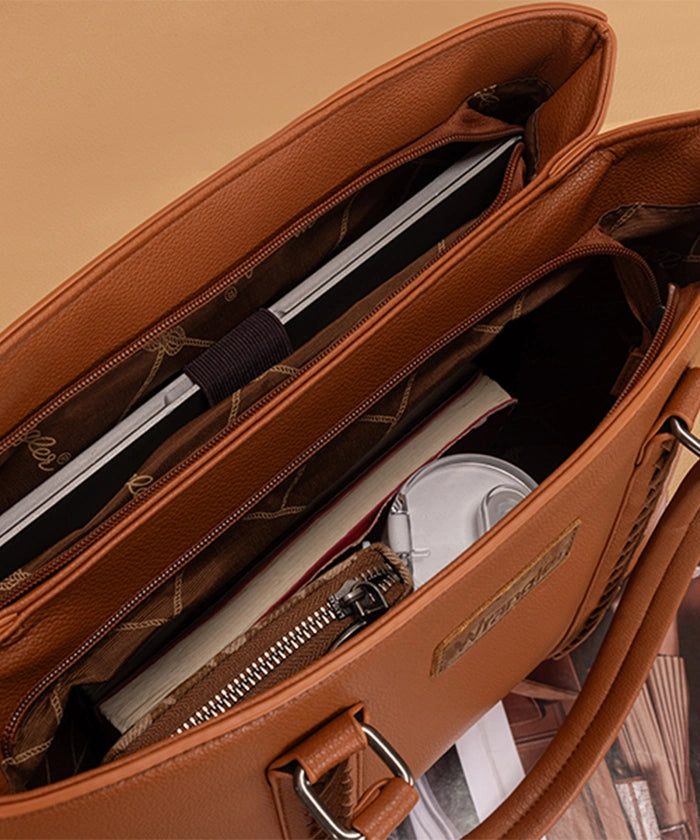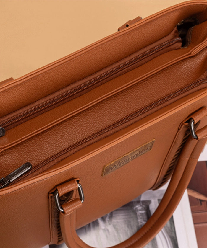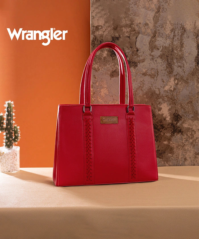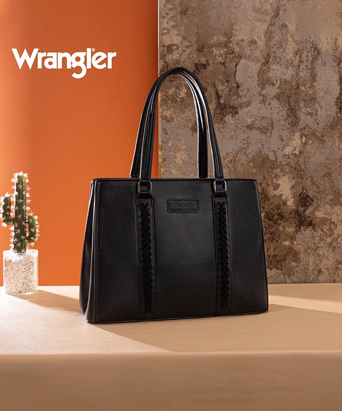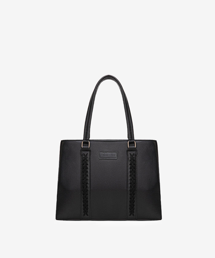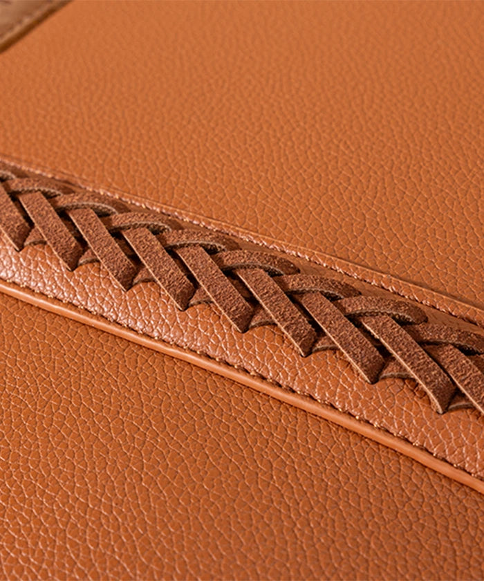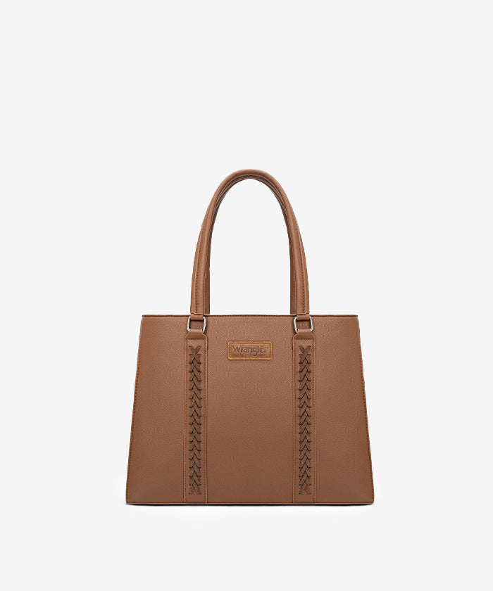 Discover the Wrangler braided tote bag, a stylish and functional accessory. Crafted from durable PU leather, it features braided stitch details and multiple compartments. Metal feet on the bottom for protection and stability.
