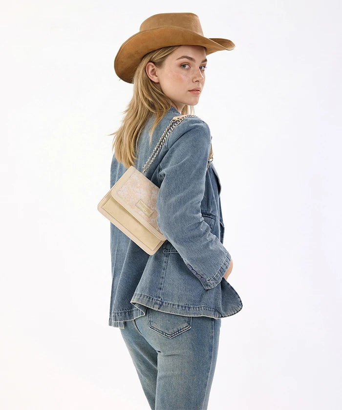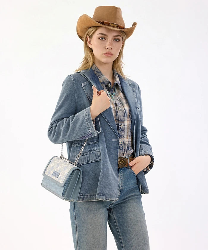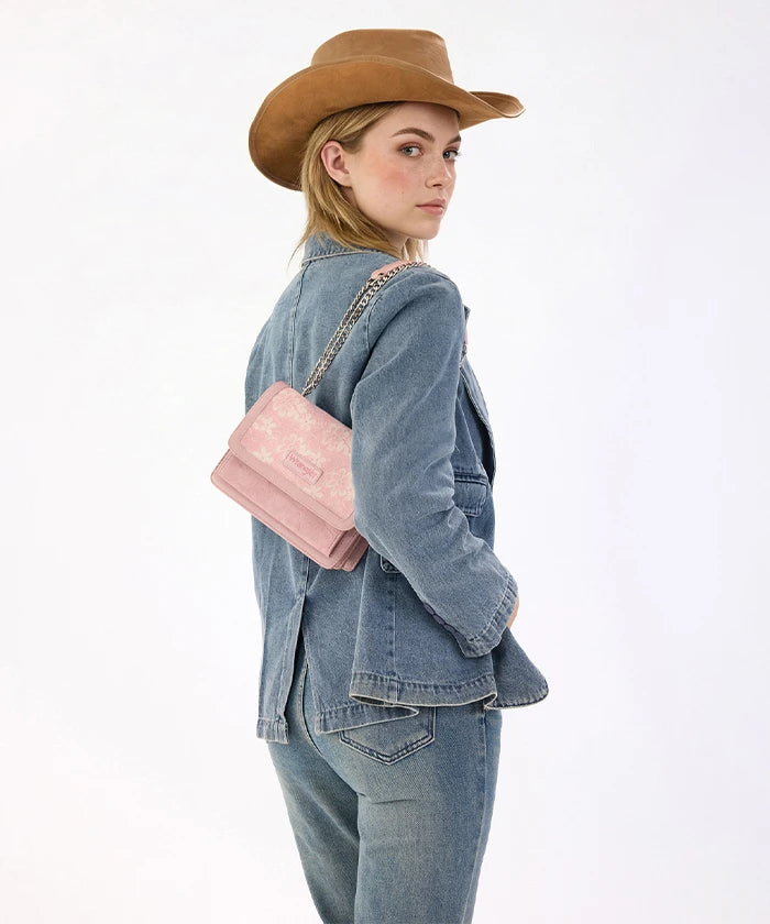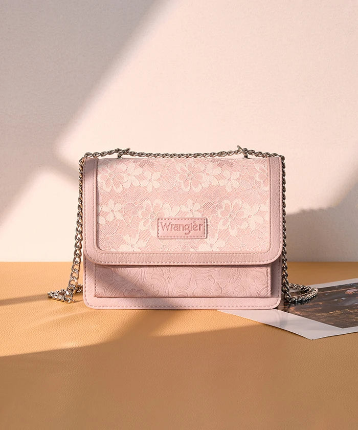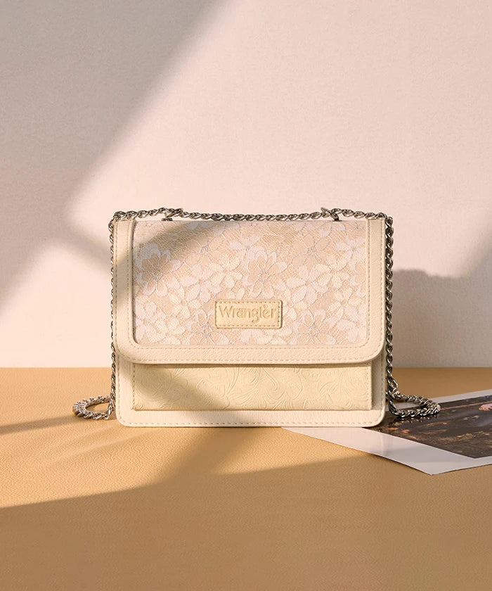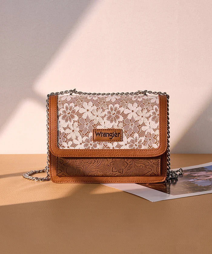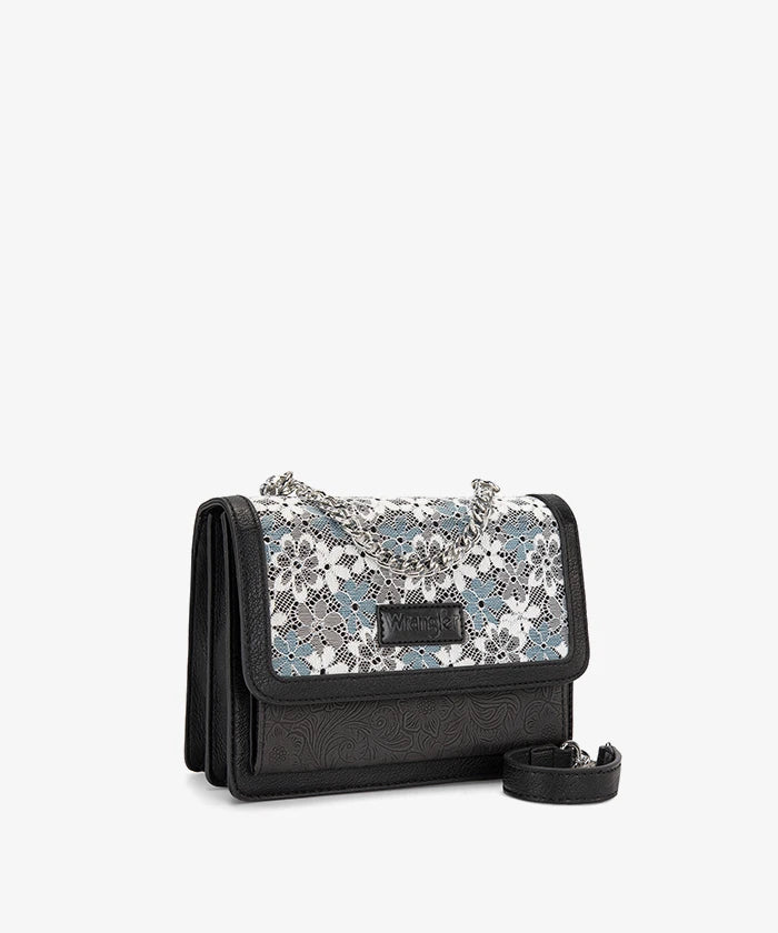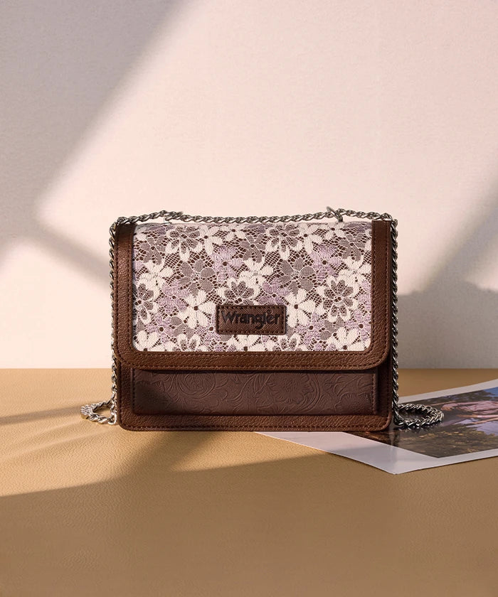 he Wrangler Floral Chain Shoulder Bag is a stylish and versatile accessory, featuring a floral lace panel and chain strap. Made from synthetic leather, this chain shoulder bag offers a fold-over flap design with multi-compartment storage, perfect for daily use and dating.