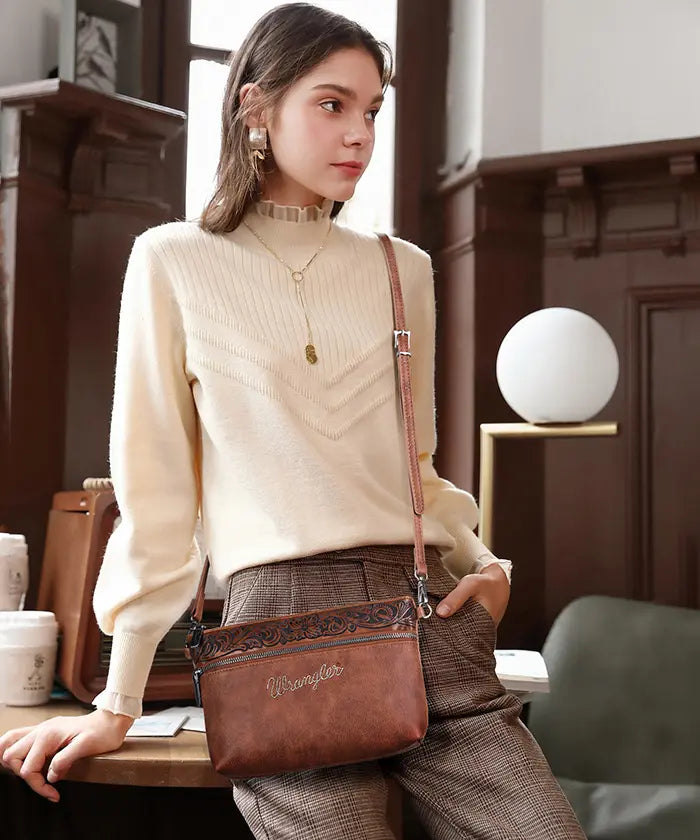 Discover the Wrangler floral crossbody purse, a chic and functional accessory. Crafted from synthetic leather with an embossed floral tooling pattern, this tooled leather crossbody purse features a dual-zipper closure for security.