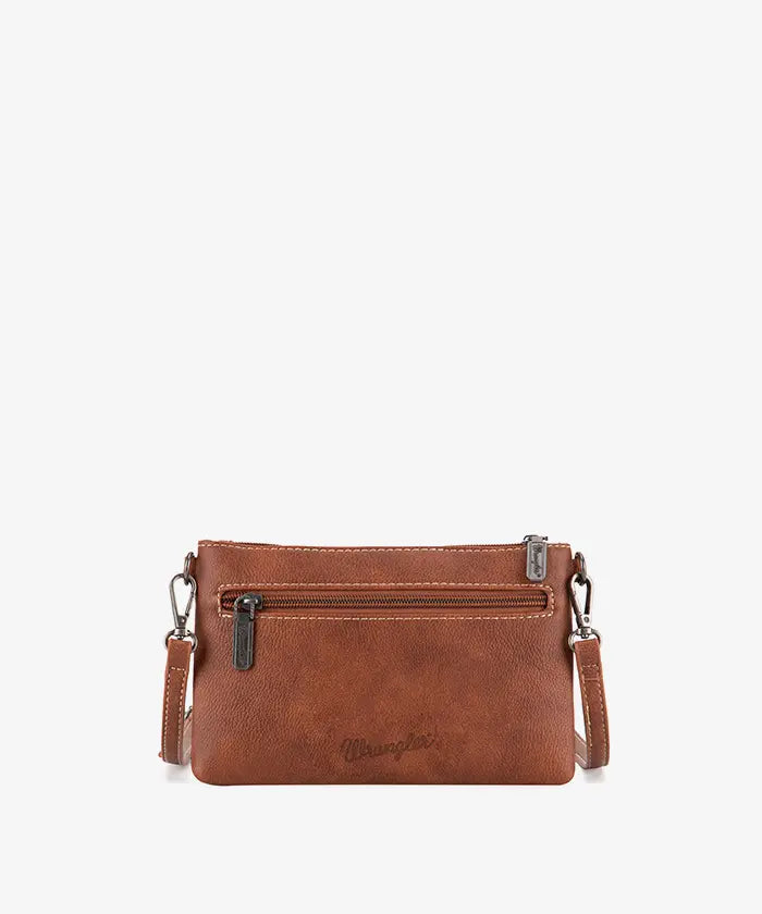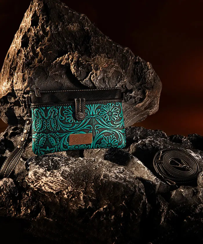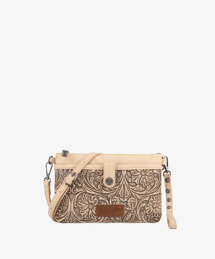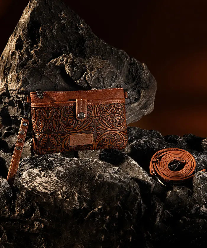 Discover the Wrangler Floral Embossed Crossbody Bag, a compact and stylish bag featuring western-inspired floral embossing. With an adjustable and detachable shoulder strap, transforming the embossed crossbody bag into a wristlet.