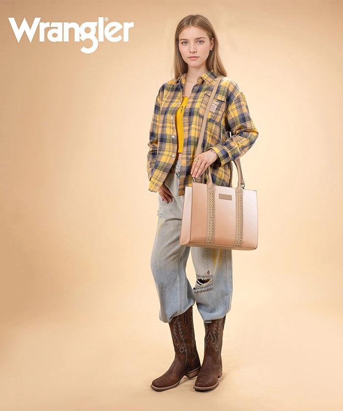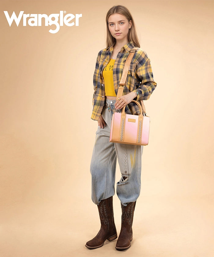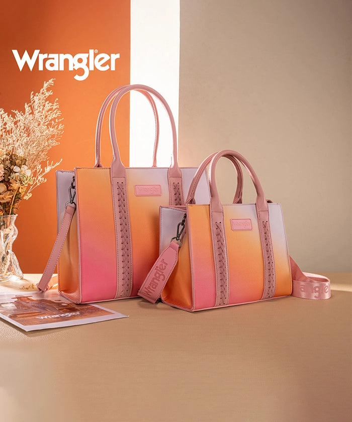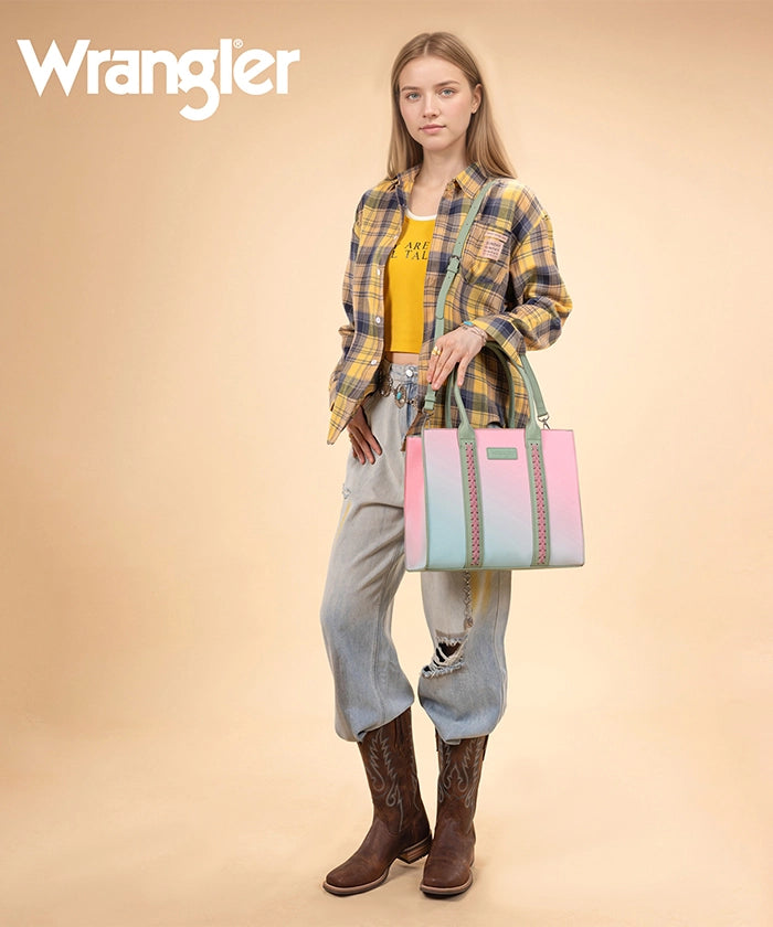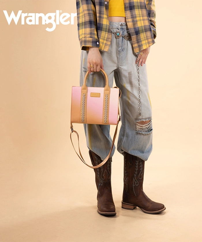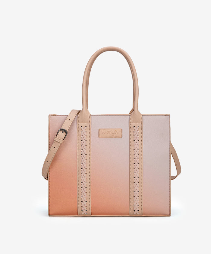 The Wrangler gradient tote bag blends modern style with everyday functionality. Crafted from premium PU leather, this gradient tote bag features a striking gradient color block design and a braided detail with an embossed logo strap.