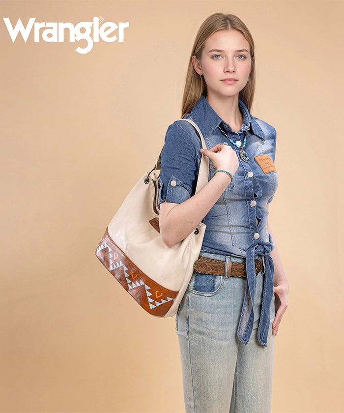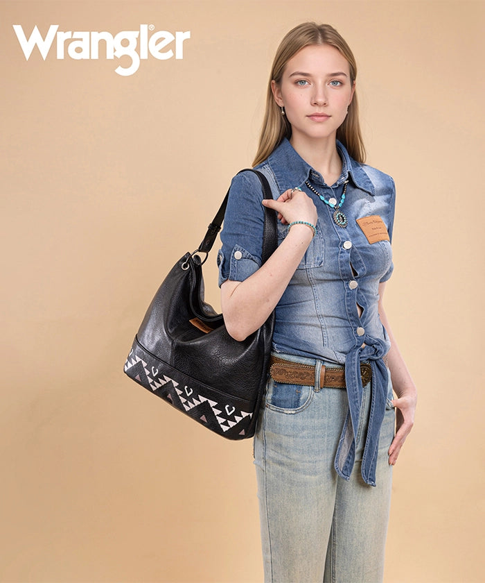 The Wrangler hobo shoulder bag combines effortless style with everyday function. Crafted from durable vegan leather, this soft-structured bag features an Aztec pattern accent and a spacious interior with multiple compartments.