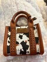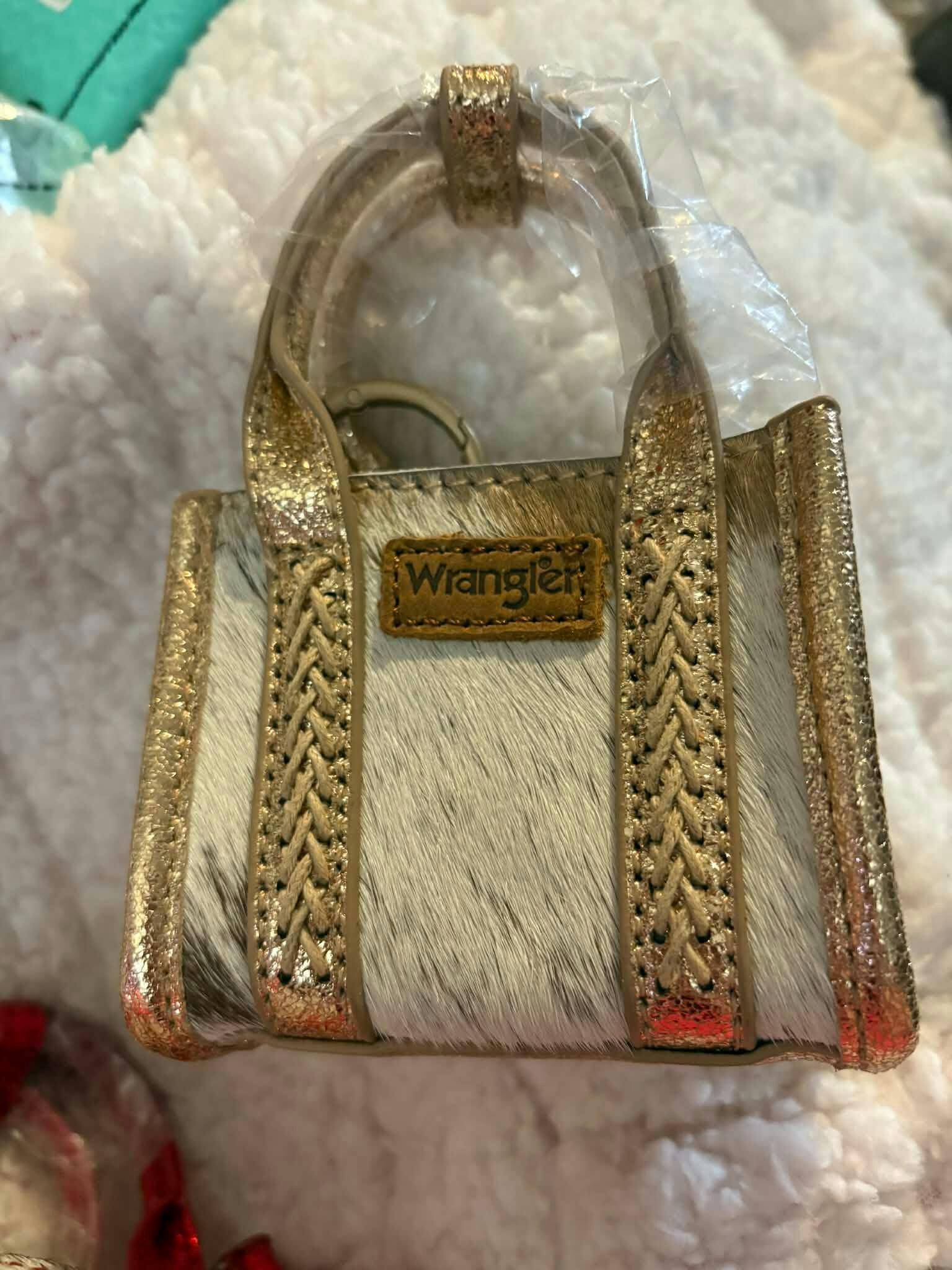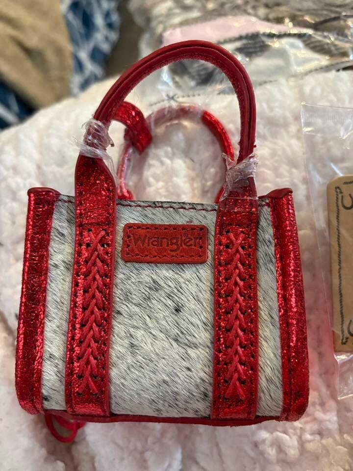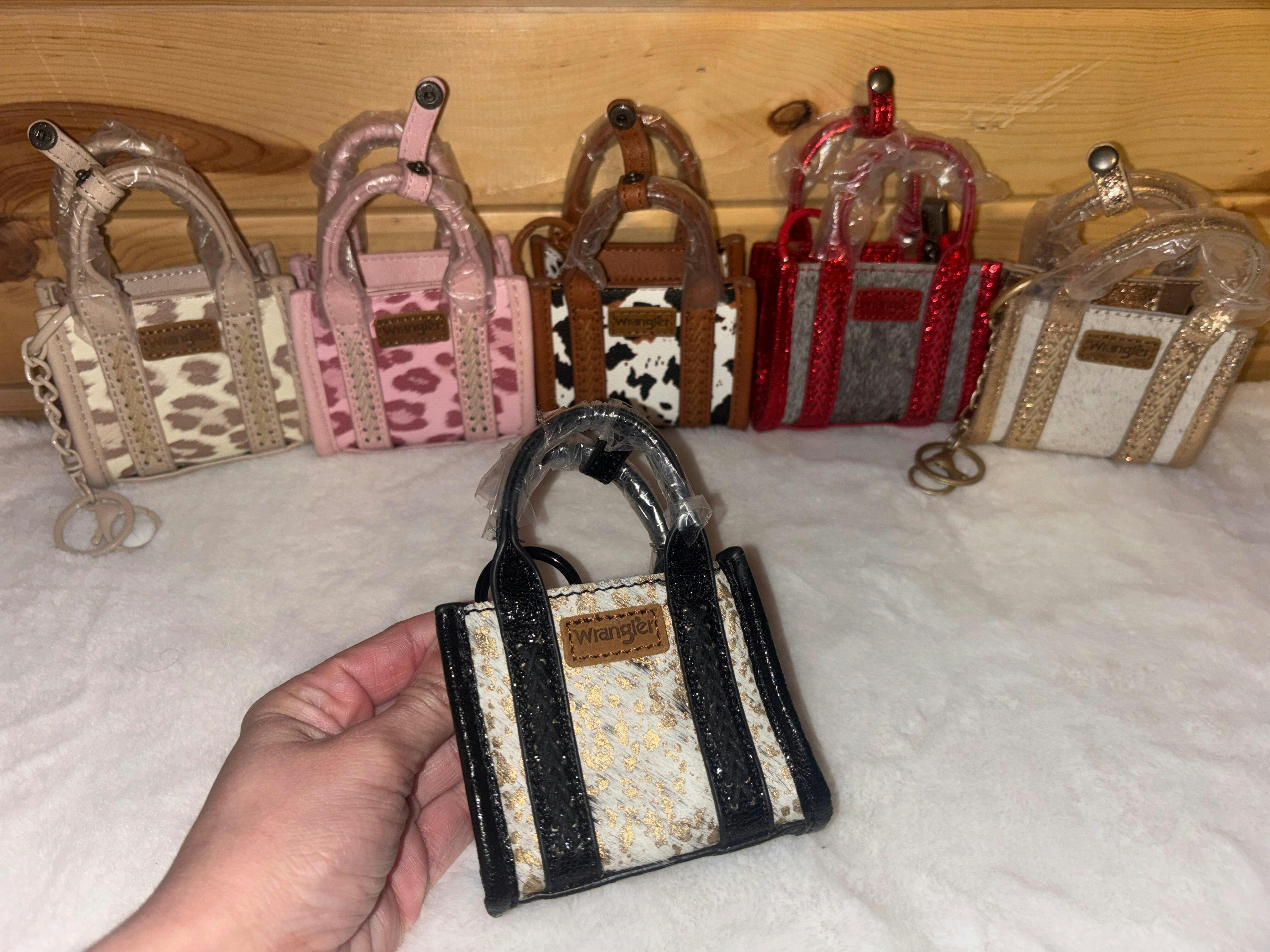 Buckaroo (classic black cow), Chipper (warm tan braid), Darling (flirty pink cheetah), Giddy (beige leopard), Mamacita (fiery red cow), Dreamy (creamy shearling), and Wrangled (secret edition). Lightweight yet detailed with subtle branding and a zip-top closure for that authentic mini-purse illusion, it's equal parts functional (holds a card or two) and frivolous—a cheeky nod to cowboy chic that's perfect for adding personality to everyday outfits without overwhelming your look.