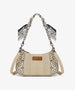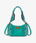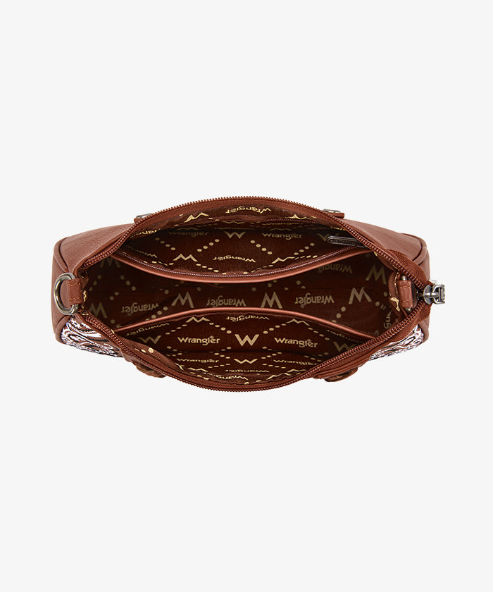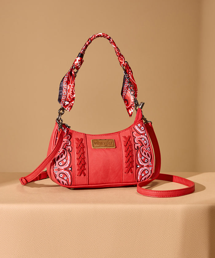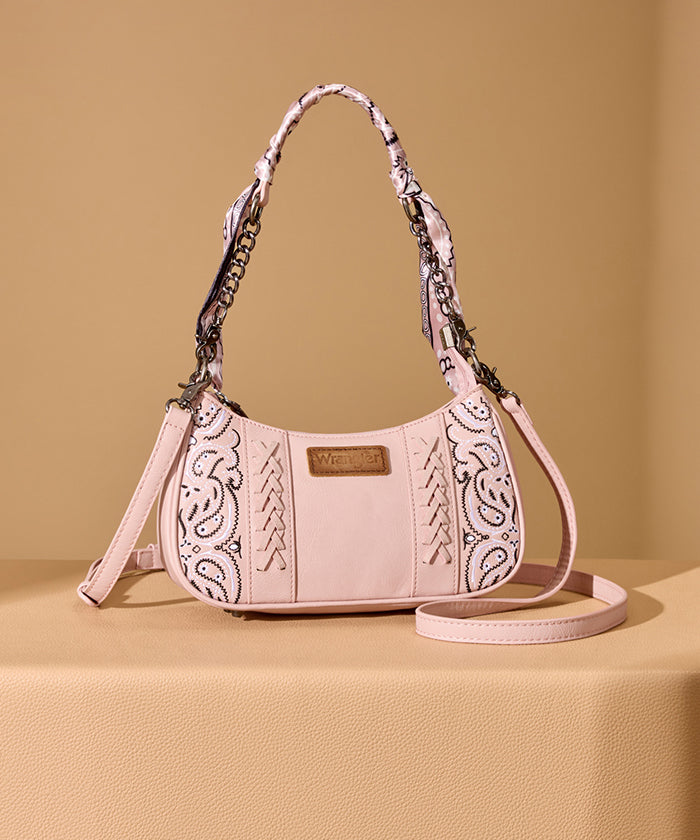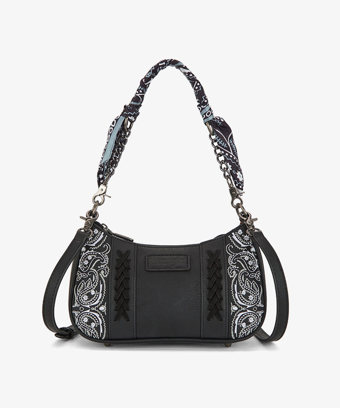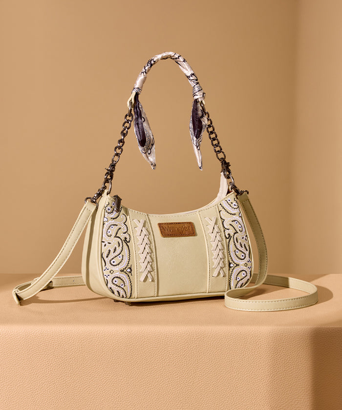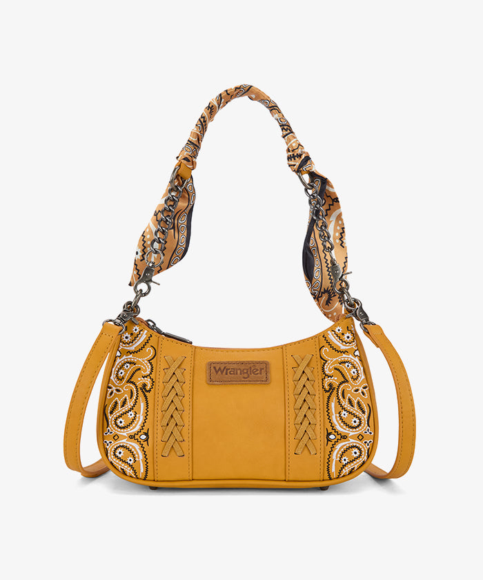 Discover the Wrangler Paisley Chain Shoulder Bag, a boho-western style faux leather bag with a paisley pattern and braided detailing. The standout shoulder strap is wrapped with a patterned scarf detail and finished with chain accents, adding a stylish and versatile touch.