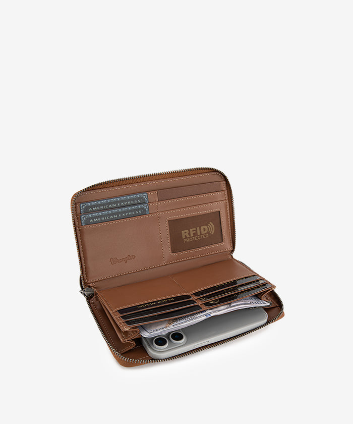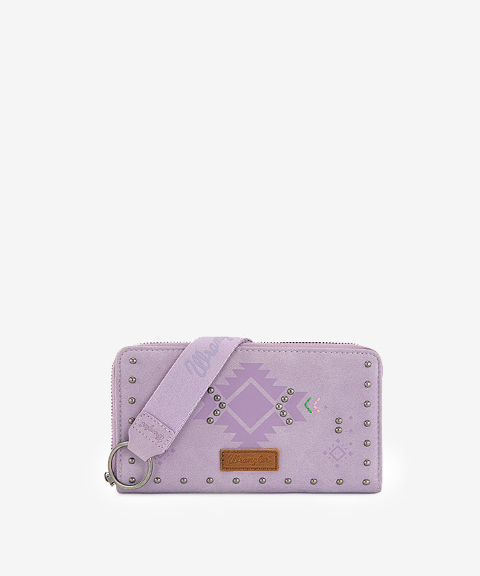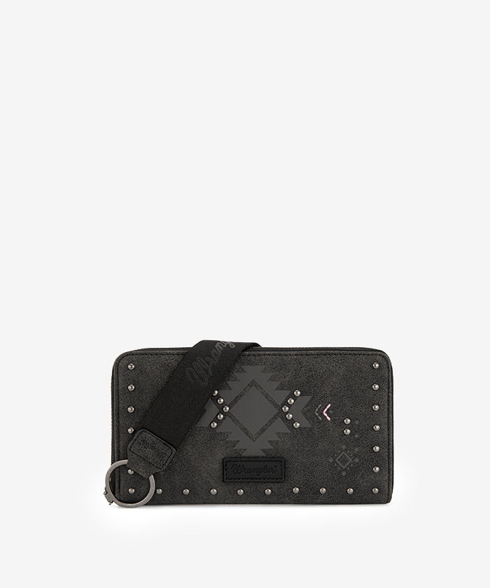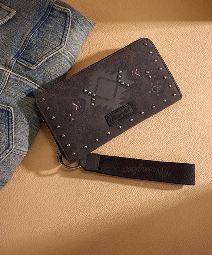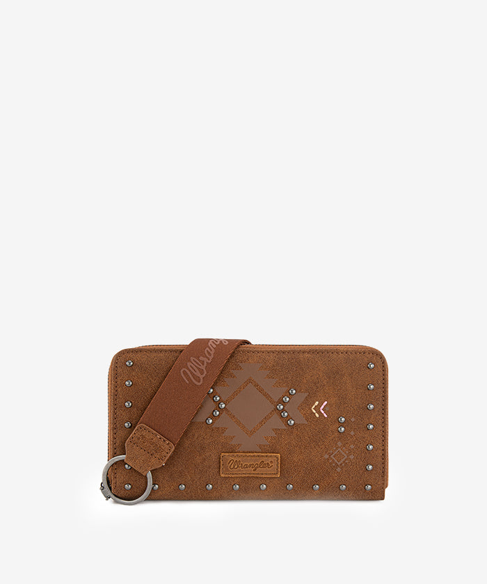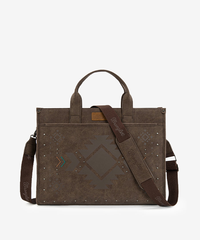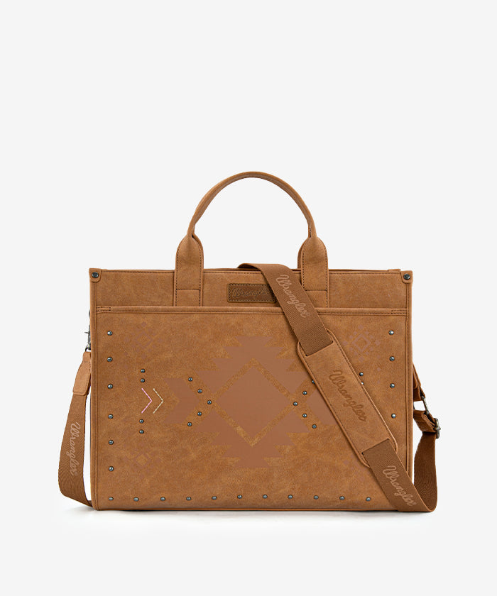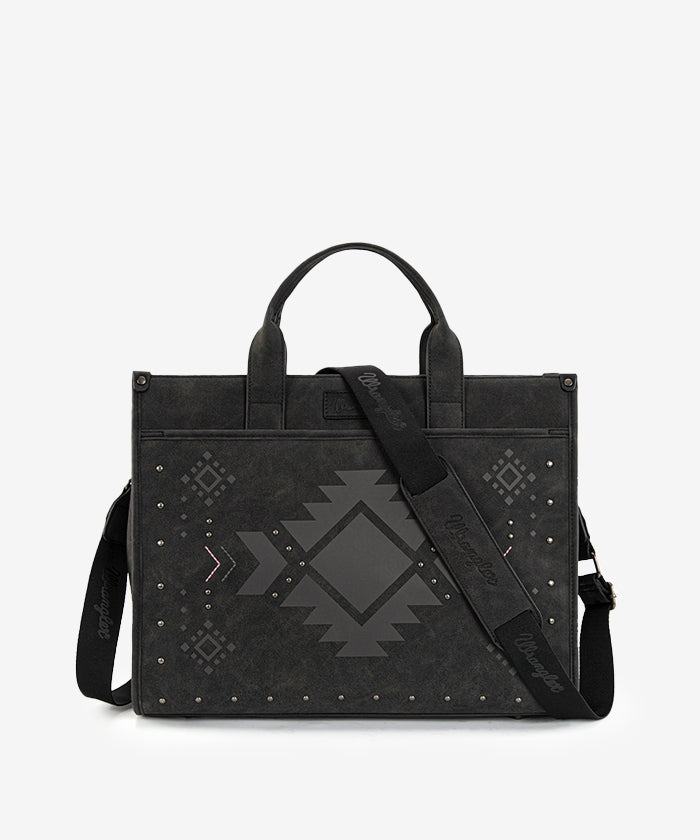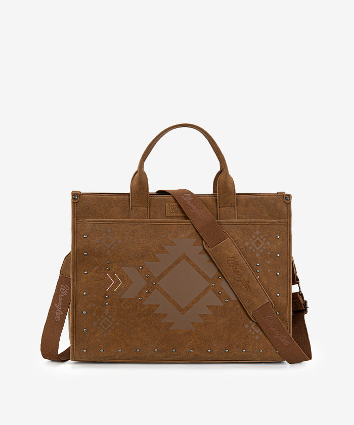 The Wrangler Aztec studded tote bag combines rugged style and everyday function with a bold geometric design and rivet detailing. Crafted from durable faux leather, this studded tote bag features a roomy main compartment and a matching wallet for organized carry.