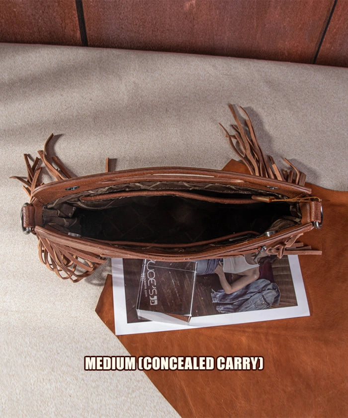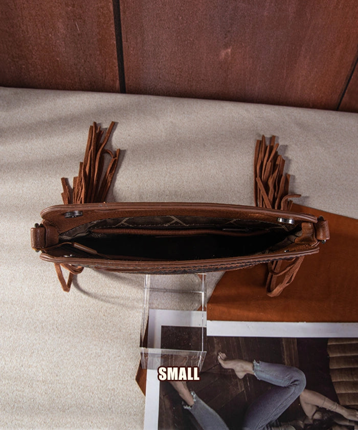 A tooled top handle with hand-coloring and a magnetic snap closure adds durability and easy access. Perfect for those who value both fashion and function, this fringe crossbody bag offers secure storage and everyday practicality.