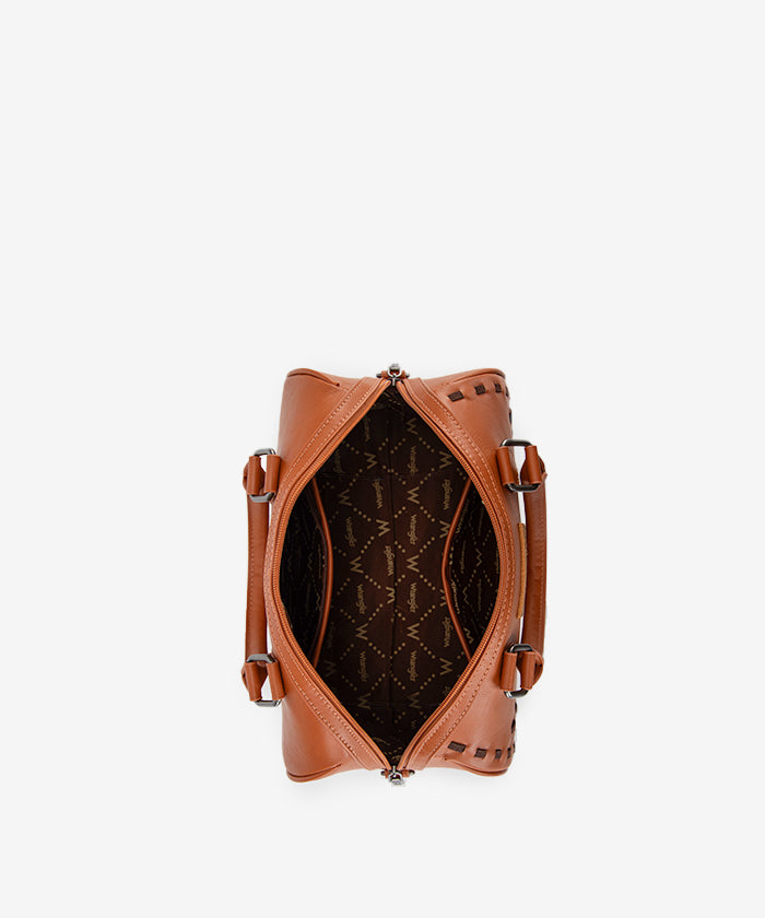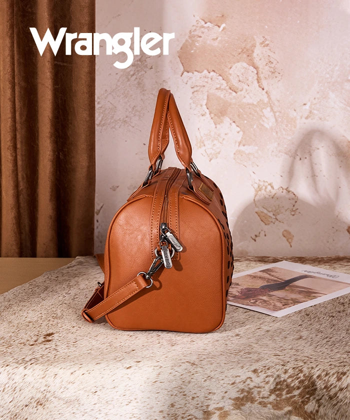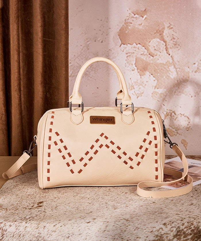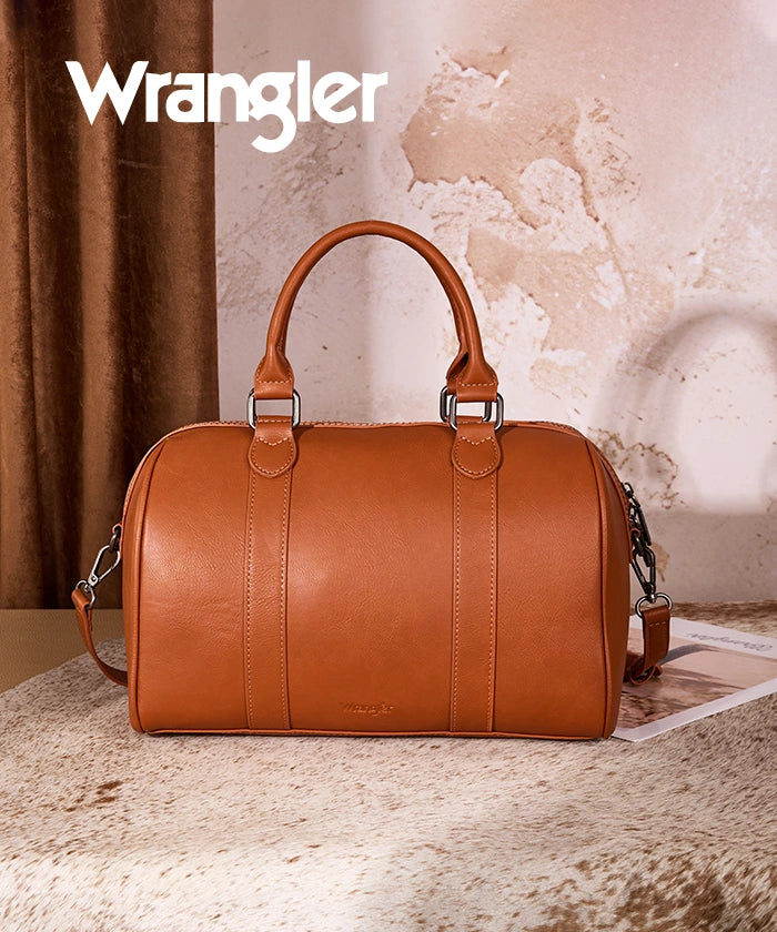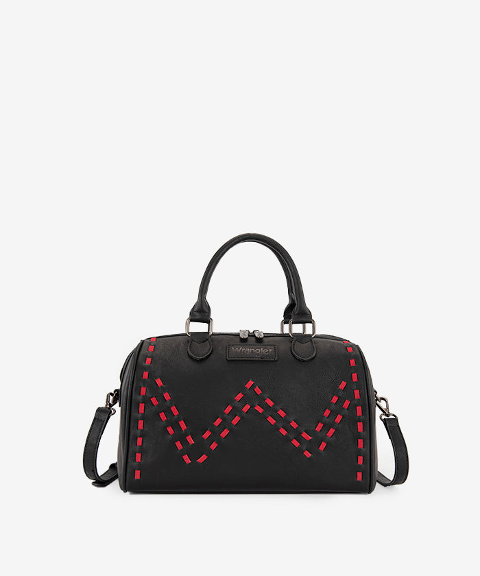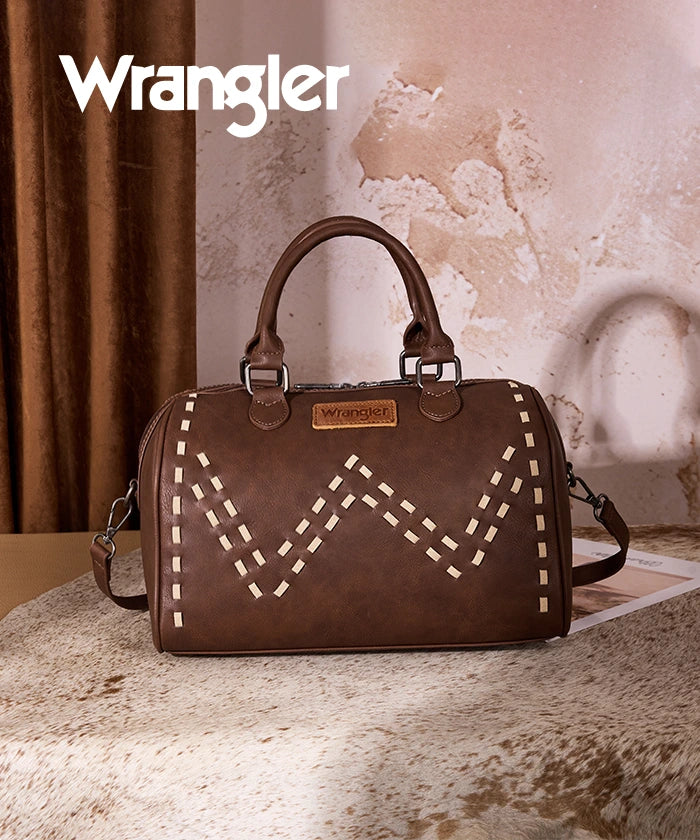 The Wrangler Top Handle Boston Handbag is a versatile and stylish choice, featuring a geometric cut-out "W" logo. Crafted from durable PU leather, it offers dual top handles and a detachable shoulder strap for multiple carrying options.