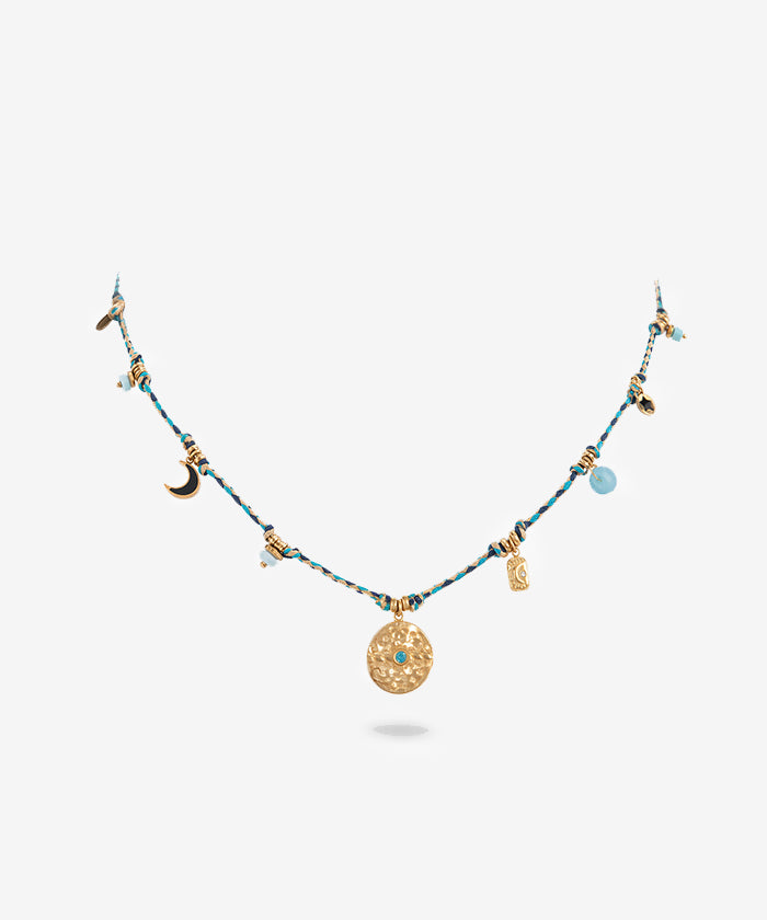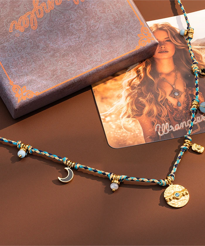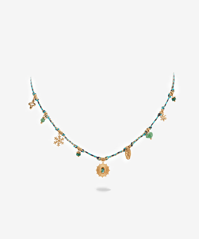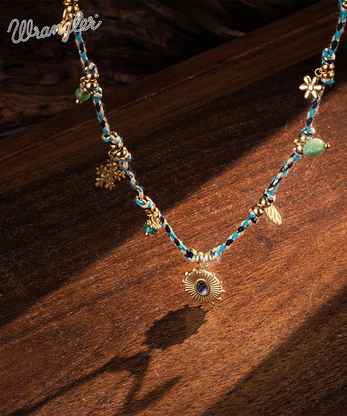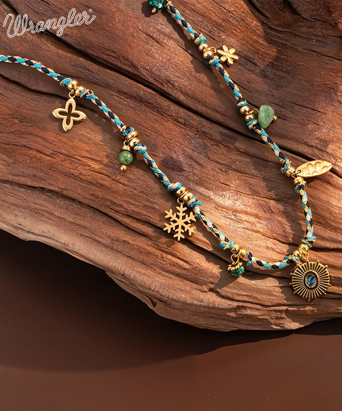 Inspired by the untamed beauty of the American West, this Western Rope Charm Necklace blends rustic charm with radiant symbolism. Hand-braided with turquoise and earth-toned threads, this piece features a medley of golden charms—each representing elements of nature and freedom: a snowflake, a wildflower, a golden leaf, and a radiant sunburst with a shimmering abalone inlay at its center.