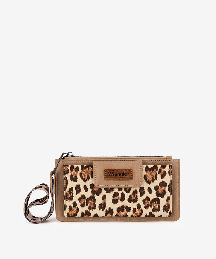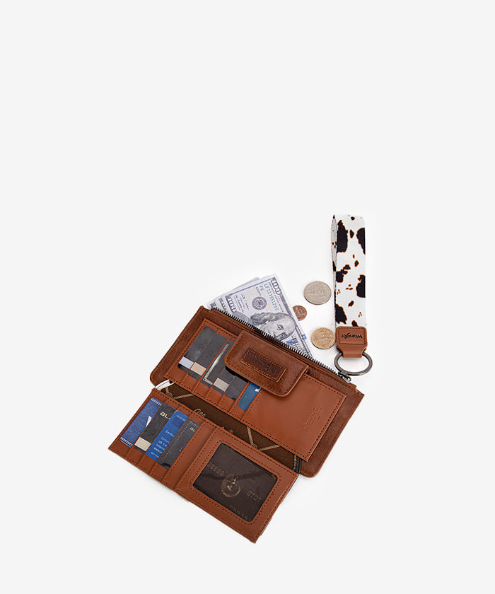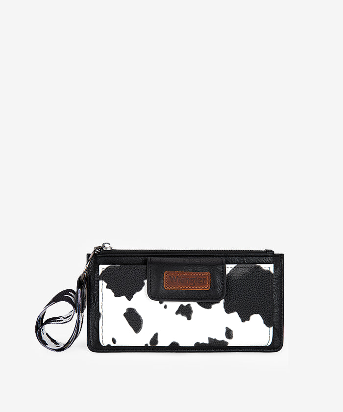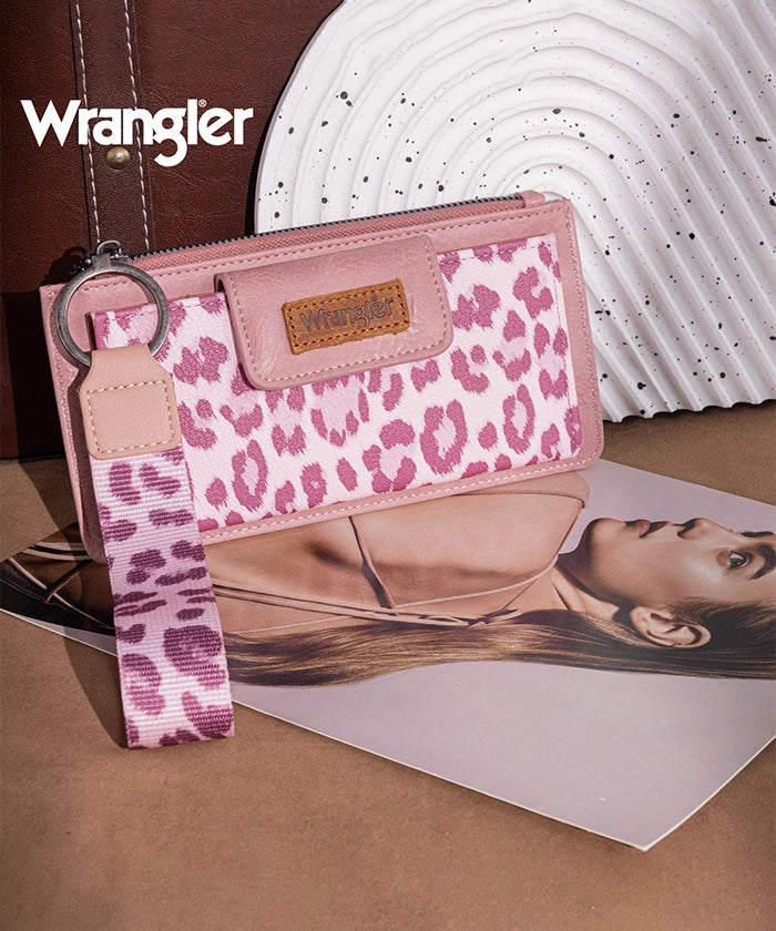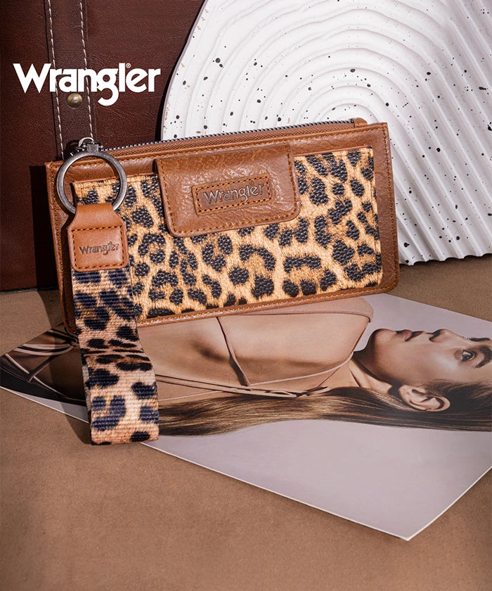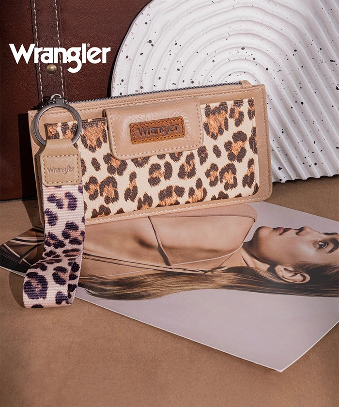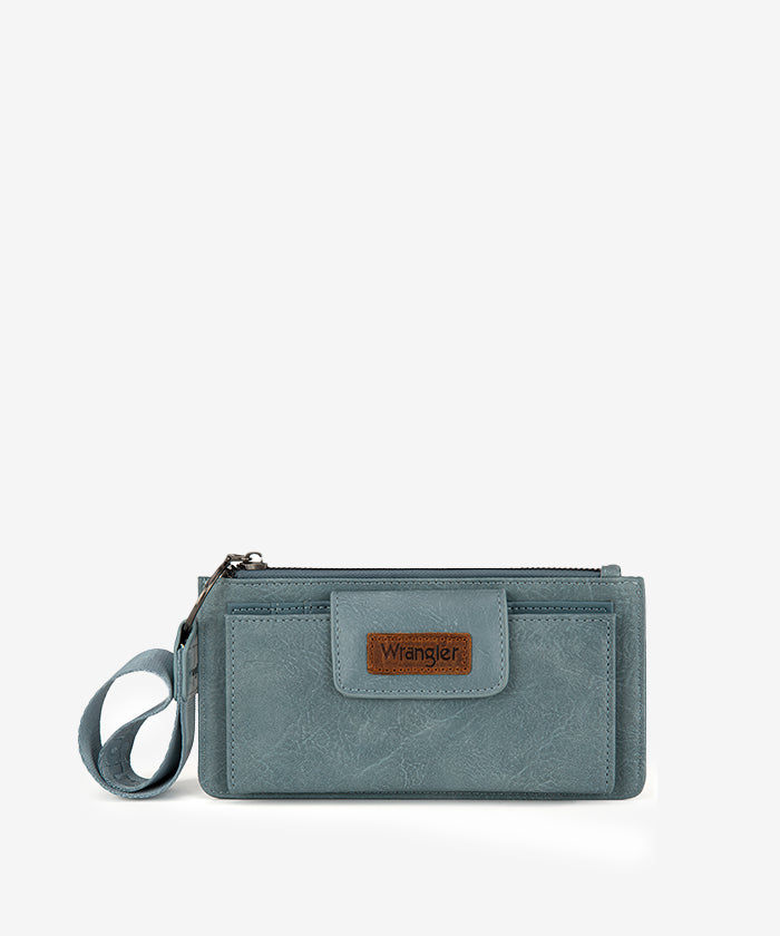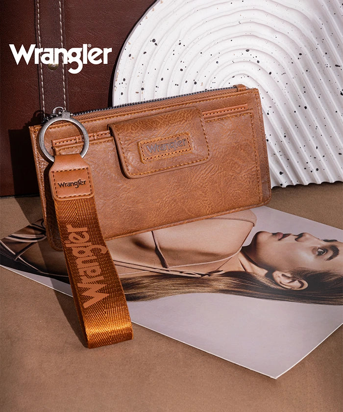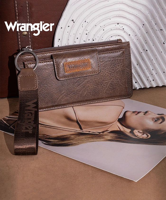 The Wrangler wristlet wallet combines style and function in a compact design. It offers card slots, a cash compartment, and a zip closure for security. Crafted from durable faux leather, it includes a detachable wrist strap for versatile carry.